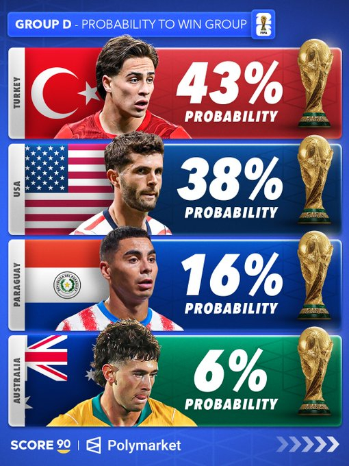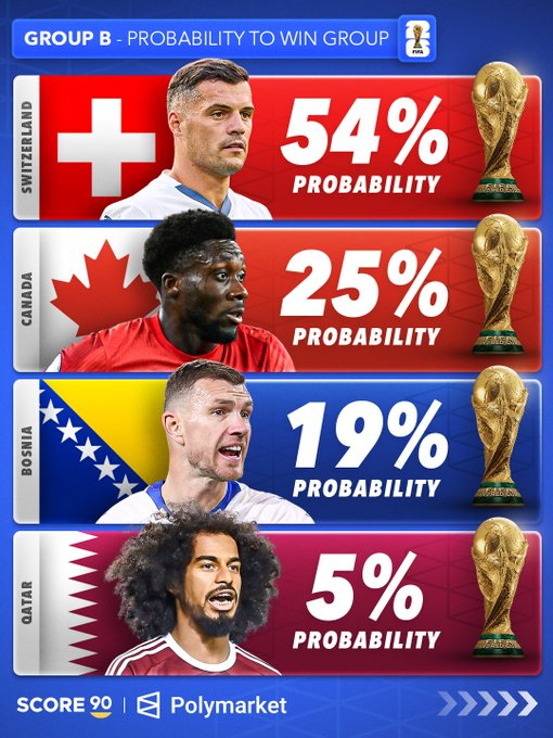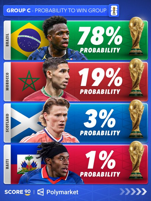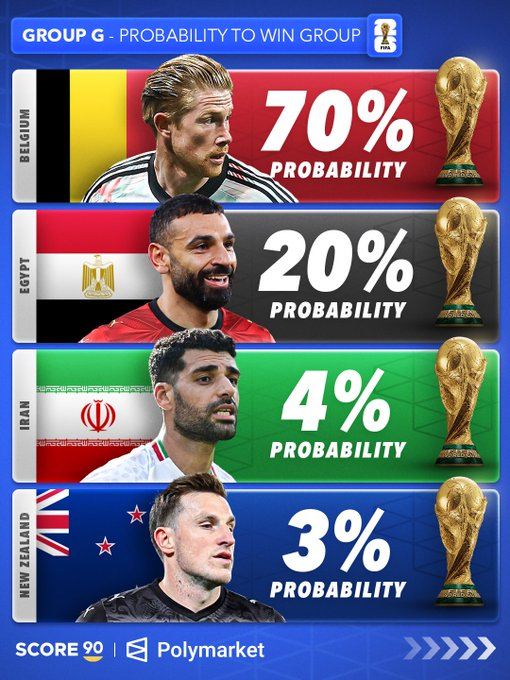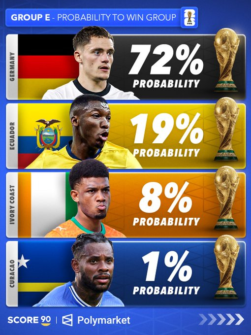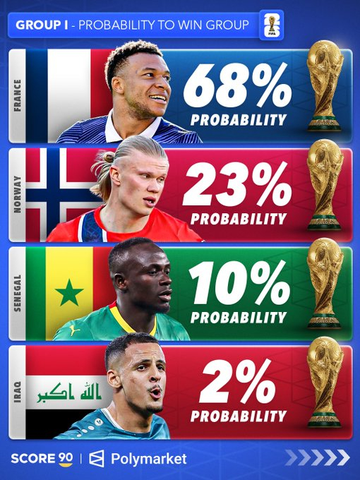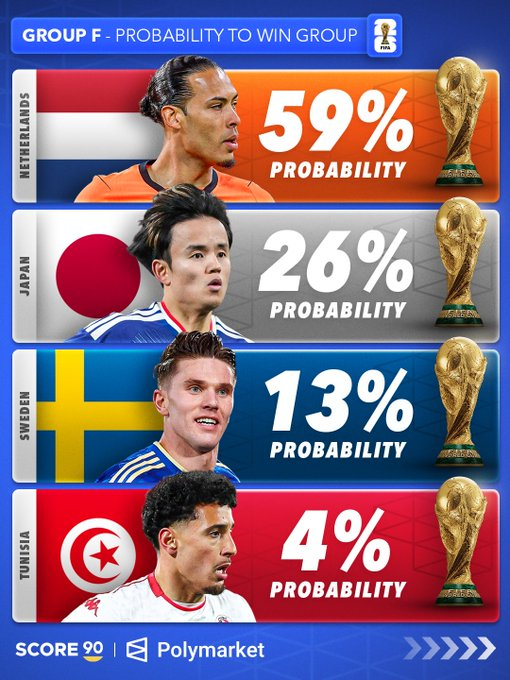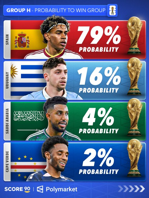 根据 Polymarket 的数据,各世界杯小组的出线概率