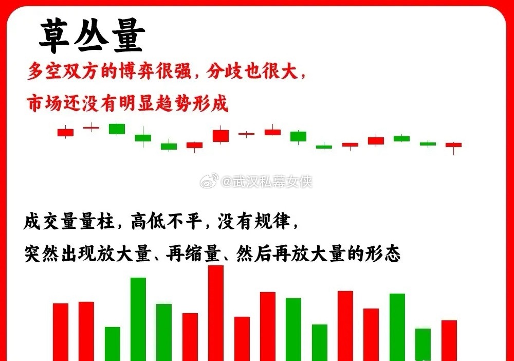 注意了!这是成交量的高阶形态,我们常见的成交量形态是倍量、天量、扩张量等等,但是今天分享的六种形态,大部分人都不知道,想聊透他的人就更少了。如果你也喜欢技术分析,那这成交量形态一定要知道。还是老规矩,点赞收藏或评论六六六支持一下,女侠每天分享炒股干货,以免以后想温习找不到了一、草丛量是指成交量的形态,一下大一下小,没有规律,放量缩量随机出现,说明此时的市场没有明显的趋势,市场的分歧比较大,买和卖的筹码都比较多,这种的量柱在低位出现,说明主力并没有吸筹二、凹洞量整个成交量形态,像一个V字形,成交量逐步的缩量,形成地量,随后成交量又出现放大,左右高,中间低。这一般是主力洗盘过后,缩量,代表市场抛压开始变弱三、支撑量股价在回调的过程里,在重要支撑位附近,比如前期低点、平台等等位置,出现连续的放量,形成量堆。股价在支撑位附近开始止跌企稳,没有跌破支撑位。说明下方的承接力量比较强四、防守量股价在上涨趋势的中继。成交量出现缩量,是上涨趋势中成交量的一半以下,缩量代表主力锁仓,并没有出现主力出货。五、攻击量股价在低位,成交量出现倍量,是平日成交量的两倍以上,还会连续出现,同时股价也同步上涨,形成趋势。说明多方力量比较强,,而且很容易突破上方压力位六、 稀释量一般出现下跌趋势当中,上方有不少套牢盘,股价开始逐步的缩量,股价缓慢下跌,也就是我们常说的阴跌。让上方筹码,在慢慢稀释,筹码下移的一个过程好了!以上就是成交量的六种高阶形态,下方我准备了对应的案例图,了解透彻成交量。希望对大家有启发,也是最为基础的内容,一定吃透。