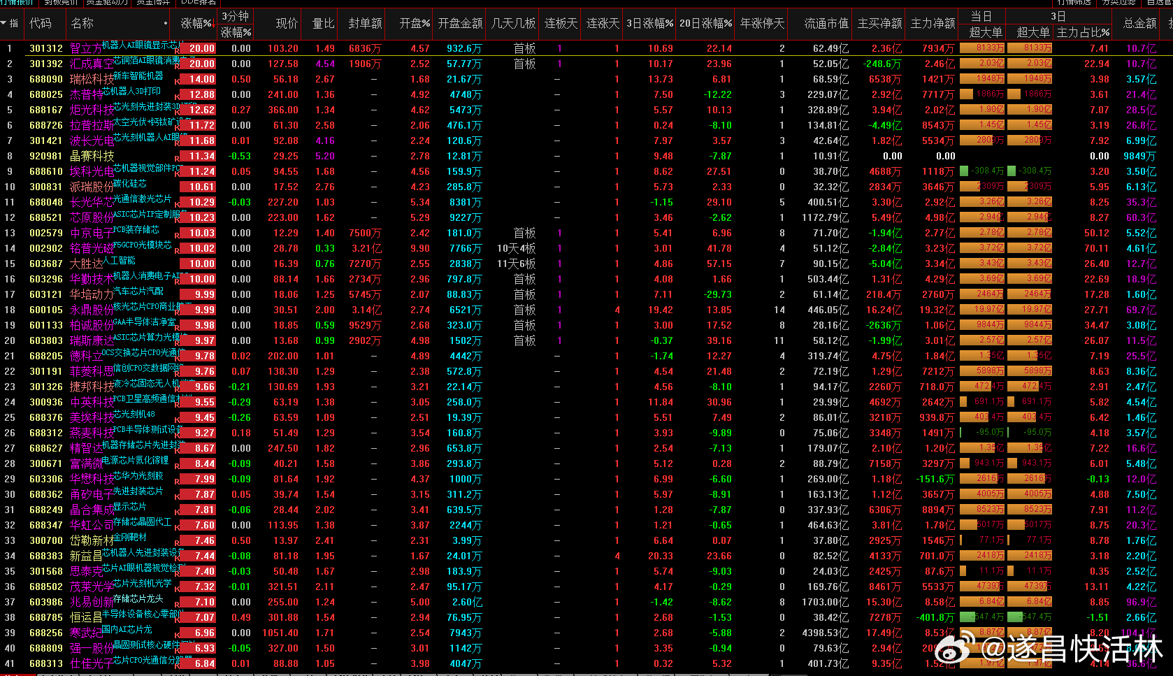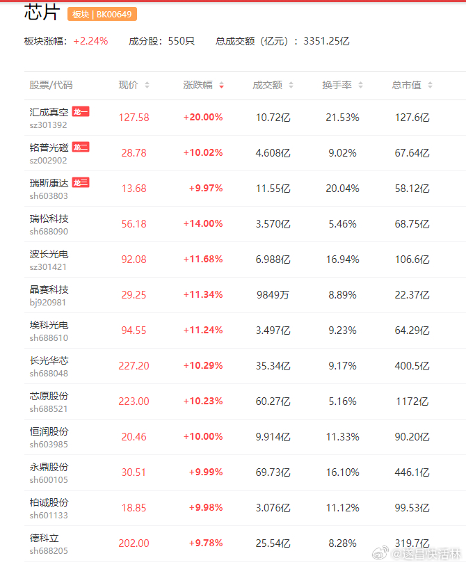 虽然预告今年一季度业绩大幅增长的存储芯片人气股德明利早盘快速炸板后回落翻绿,拖累整个存储芯片概念走出冲高回落走势,但算力芯片、半导体设备等方向整体表现依旧亮眼,汇成真空、柏诚股份双双涨停,芯原股份涨逾10%,寒武纪股价重返1000元上方。