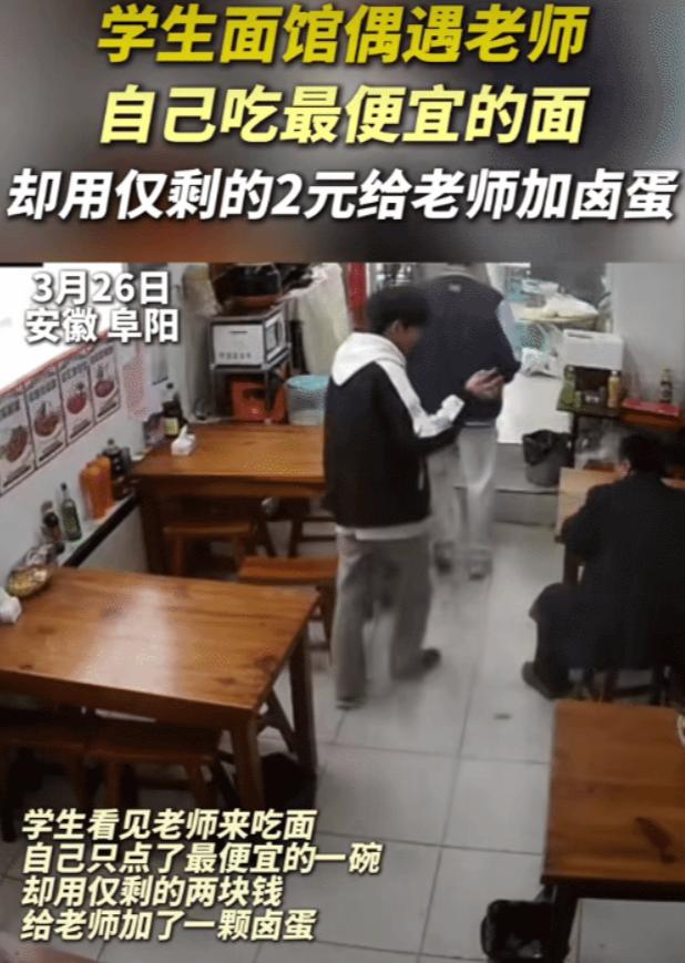 破防了!安徽,学生在面馆吃面,偶遇老师来吃面。没想到,学生悄悄跑到后厨用身上仅剩两块钱给老师加颗卤蛋,不让老师知道。老板说:“把我感动的眼泪都出来了。” 傍晚五点多,安徽阜阳临泉五中附近那条街,正是最热闹的时候。放学的放学,下班的下班,路边小店都冒着热气。 一家普通面馆里,两个初三体育生推门进来。 运动服还没干透,额头上挂着汗,一看就是刚练完没多久,那种跑完步腿还发软的状态。 俩人坐下,翻了翻菜单,点了最便宜的素面,七块钱一碗,还问了句能不能免费续。吃饱就行,别的不想了。 他们正埋头吃着呢,门又开了。进来的是他们老师。 老师也是忙了一天的样子,脸上带着那种不太明显但你一看就懂的疲惫。 坐下来,也点了碗素面。 学生抬头看见了,礼貌喊了声老师好,没多说什么,继续低头吃自己的。 但其中一个男孩多看了一眼老师那碗面——光秃秃的,就是素面,什么配菜都没有。 然后他做了一件事。 他摸了摸口袋,里面就剩两块钱。这是他今天所有的零花钱了,本来可能想买瓶水喝,或者随便买点什么。但他站起来,没吭声,走到后厨门口,找到老板,掏出手机,一个字一个字打了一行话: "我只剩两块钱了,给我老师加个卤蛋吧,别说是我加的。" 老板看完这行字,愣了一下,眼眶当时就红了。 没多问,点了点头,转身进厨房,把一颗卤蛋放进老师的碗里端过去。老师看了看,有点意外,以为是老板送的,笑着说了声谢谢。 男孩已经坐回去了,跟没事人一样继续吃面。 吃完以后,两个人起身,又跟老师打了声招呼,就走了。背影消失在外面的暮色里,头也没回。 老板站在柜台后面,看着他们走远,心里那股劲儿一直憋着。最后还是没憋住,走到老师桌前,把刚才的事一五一十说了。那两块钱,是学生口袋里最后的钱,人家专门交代了不让你知道。 老师手里的筷子停在半空,好几秒没动。然后慢慢低下头,眼眶红了,偷偷用手背抹了一下,声音很轻:"我还以为是你给的。" 他是真没想到。一颗两块钱的卤蛋,在他的认知里,不应该是学生干的事。 老板后来说起这件事,语气还是收不住:"我当时眼泪都快掉下来了,说实话,现在这么懂事的小孩,真的太少见了。" 可能有人觉得,两块钱嘛,至于吗。 但你想想,一个刚跑完高强度训练的体育生,身体消耗是实打实的。饿是真饿,渴也是真渴。两块钱虽然不多,但对他来说,那就是今天能自由支配的全部了。一瓶水都不一定够买。 他把这两块钱,拿去给老师加了颗卤蛋。 不是他自己不需要,是他觉得,老师那碗光面看着太寡了。 而且他不说。不当面提,不让老师知道是自己。怕什么呢?怕老师心里过意不去,怕这份好意反倒变成一种负担。所以他用打字的方式,用最不引人注意的办法,把这件事悄悄藏进一颗卤蛋里,让老板帮忙递过去。 你说这像个十四五岁孩子干的事吗?这份细腻和周全,说实话,很多大人都做不到。可他就是个孩子,一个还在靠续碗免费素面填肚子的初三学生。 老师那句"我还以为是你给的",说出来好像很平淡,可你仔细想想,挺让人鼻子发酸的。他没预料到学生会在意自己吃得好不好,会注意到自己碗里连个配菜都没有,更没想到有人愿意把口袋里最后的钱掏出来,就为了悄悄加颗蛋。 但反过来想,学生为什么会这样? 因为老师平时对他们的那些好,他们都记着。可能是训练时多说了句注意别受伤,可能是哪次犯了小错没被计较,也可能就是日常里一些很小很小的事。 孩子嘴上不说,心里全有数。只是平时找不到机会表达,直到那天傍晚,在一家面馆里,用两块钱和一颗卤蛋,把攒了很久的心意递了出来。 有人说得挺对:先有好老师,才有好学生。这话不是在说教学水平,而是那种看不见的影响。你怎么对孩子,孩子就怎么长。你种下什么,他就会结出什么。只不过果实什么时候冒出来,你自己可能完全不知道。 这个故事里还有个人不该被忽略,就是那个老板。他看到手机上那行字的时候,其实完全可以只是照做,事后也不提。但他没有。学生走了以后,他主动走到老师面前,把前因后果都讲了。 他觉得这份心意不应该就这么无声无息地过去。有些善意,如果没有人帮忙说出来,可能就真的沉下去了,谁也不知道。他把这颗卤蛋的分量,完完整整交到了老师手上。 那碗面后来肯定凉了。但有些东西不会凉。就是那种人跟人之间很朴素的在意,不需要多大动静,不需要多少钱,甚至不需要让对方知道。它就安安静静待在那里,等到某一天,被一个细心的人看见,再被另一个厚道的人说出来。 然后你才发现,原来这个世界没有那么冷。
