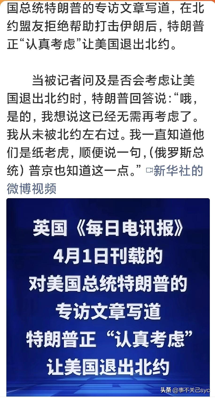 英国《每日电讯报》4月1日刊载的对美国总统特朗普的专访文章写道,在北约盟友拒绝帮助打击伊朗后,特朗普正“认真考虑”让美国退出北约。 当被记者问及是否会考虑让美国退出北约时,特朗普回答说:“哦,是的,我想说这已经无需再考虑了。我从未被北约左右过。我一直知道他们是纸老虎,顺便说一句,(俄罗斯总统)普京也知道这一点。” 这则新闻揭示了2026年4月1日跨大西洋联盟面临的重大危机。由于北约盟友拒绝在美以对伊朗的军事行动中提供支持,美国总统特朗普公开威胁要让美国退出北约,并发表了极具冲击力的言论。这并非简单的“退群”威胁,而是对二战后西方安全框架的一次根本性质疑。 特朗普此番表态的直接原因是北约盟友拒绝响应其号召。美国希望盟国派舰艇协助重新开放被伊朗封锁的霍尔木兹海峡(全球约20%石油经此运输),但遭到英国、法国、德国等主要欧洲国家拒绝。这些国家普遍认为,美以对伊朗的军事打击并非北约的集体防御行动,不愿被卷入一场“不是我们的战争”。美国国务卿鲁比奥也批评北约成了“单行道”,美国保护欧洲,欧洲却拒绝提供基地使用权。 如果美国真的退出,将对北约造成毁灭性打击: 联盟解体危机:美国是北约的绝对军事核心,其退出将意味着这一维系了70多年的军事同盟事实上的终结。正如鲁比奥所言,没有美国就没有北约。 地缘政治变局:这将是二战结束以来西方安全体系最重大的变故。特朗普认为美国不应再“自动”保护欧洲,而欧洲则显示出了在安全决策上的独立倾向,不再唯美国马首是瞻。 总的来说,这是一次因中东战事引发的、涉及联盟存续的根本性危机。它表面上是关于北约是否应介入伊朗战争,深层则是美国与其传统盟友之间关于“公平分担”、“战略自主”以及“谁为谁而战”的激烈碰撞。 北约作为全球最大的军事集团,是冷战留下的巨大怪兽,华约解体,冷战结束,北约本来就失去了存在的必要。但是美国为了维持其全球霸权,继续以北约为载体,以价值观为纽带,维系这个过时的庞大的军事集团。 冷战结束以来,美国发动的所有战争无不没有北约成员国的参与,成为危机频发,世界动荡的策源地。 北约解体,是大势所趋,也是世界和平之希望。 值得关注和期待!