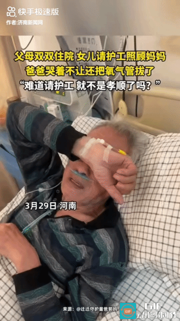“太自私了!”河南,父母双双生病住院,独生女子没办法一个人照顾两个老人,就花钱请护工照顾妈妈,她就可以照顾爸爸了。可爸爸知道后不同意,说护工照顾不好,没有女儿尽心,哭着闹着不让请护工,让女儿亲自照顾,女儿不答应还拔氧气管子威胁女儿,说女儿不孝顺,小时候女儿生病了,都是妈妈衣不解带的照顾,现在妈妈生病了,女儿却不愿意照顾了。 女儿既伤心又无奈,她不明白爸爸为什么就不能体谅一下自己的难处,自己实在是分身乏术了,一个人照顾两个生病的老人根本就不可能,她还得顾自己的小家呢。她不明白了,难道请护工就不算孝顺了吗? 对此有网友说:孩子如果生病住院了,父母都是日夜陪伴,没有一个父母花钱请护工帮忙看的,再难都是亲力亲为,做女儿的为啥不能? 也有网友说:这爸爸太自私了,一个人照顾两个病人太累了,请假的钱都够请护工费了,自己也不会那么累。我一个同事就是他妈妈病了,嫌请护工费钱,非让俩儿子轮流照顾,不听就闹腾,结果她住了半个月的医院,俩儿子每人扣全勤奖和工资加一起4千多,请个护工一天才150,等她出了院一算账又后悔了,两儿媳妇气的都不上门了! 还有网友说:都难,但是不要在老人最无助的时候请护工,要沟通好,老人家会体谅的! 也许爸爸也是心疼女儿,毕竟请护工要花钱,爸爸不想女儿花那冤枉钱。但爸爸也应该体谅女儿,一个人照顾两个老人本身就很累,很多时候是力不从心。女儿请护工也是为了更好的照顾妈妈,不然有时候自己顾及不到,难免会照顾不周,有个护工帮忙会更省事一些。 而且护工在照顾病人方面会更加的专业,也能给妈妈更好的照顾,做父亲的应该理解女儿的难处,更不应该逼迫女儿,不然等女儿累倒了,谁来照顾你们啊! 做爸爸的要理解女儿,当然女儿也要理解爸爸,遇到问题可以沟通,然后想到解决办法,而不是拿生命开玩笑! 对此你怎么看? (视频来源:河南新闻网,侵删[祈祷])