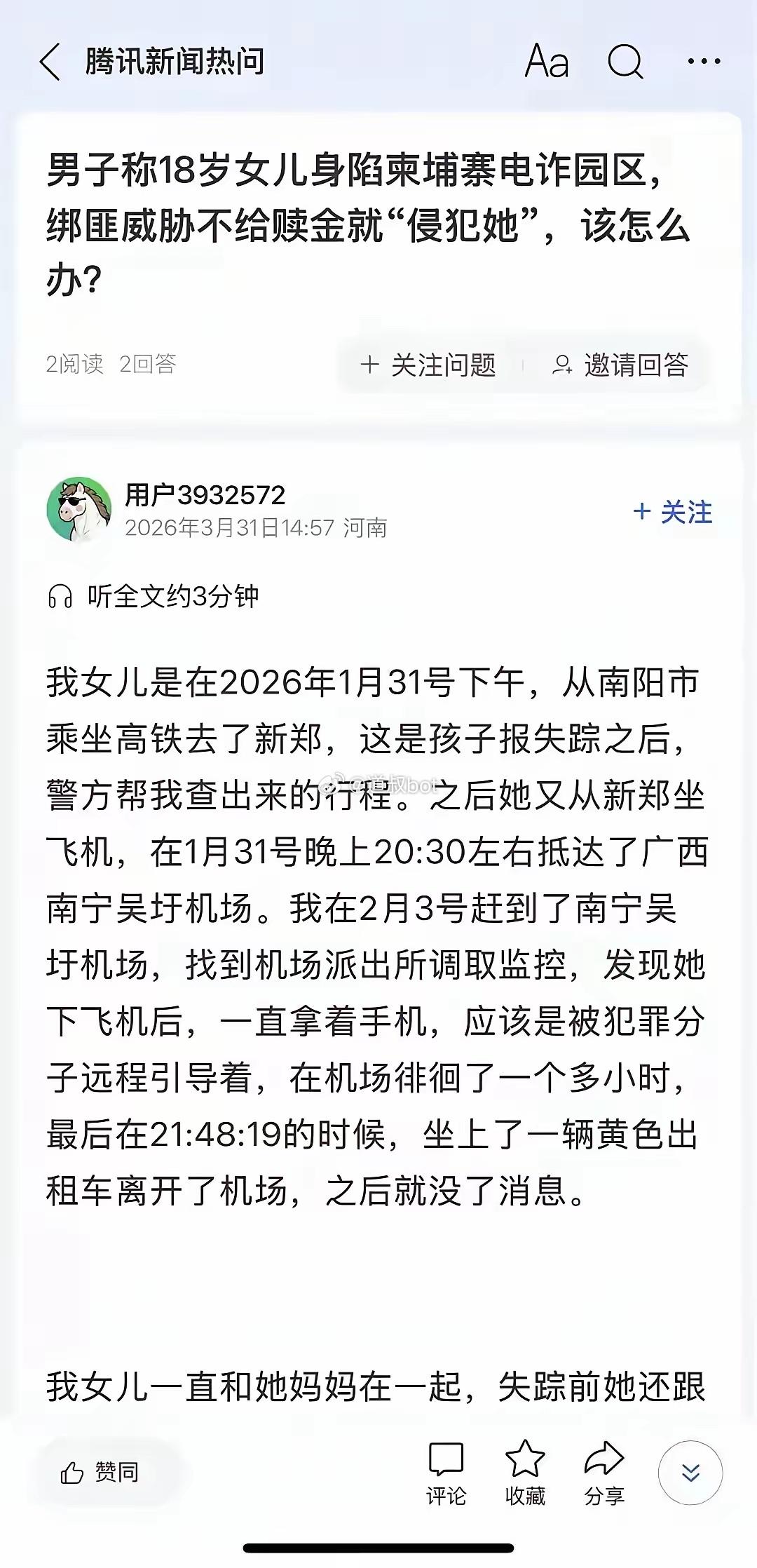 河南 19 岁女孩被诱骗到柬埔寨,家属交11 万赎金仍不放人,反而遭到性侵威胁。 这名女孩化名锦锦,1 月 31 日从南阳搭高铁到河南郑州新郑机场,坐飞机到南宁,搭乘一辆出租车后失联。从女孩的行踪看,她应该是误信了某种传言,可能是柬埔寨有高薪,能挣大钱,所以在幕后的人一步步的遥控指挥下,偷渡进入了柬埔寨,随即被一名中年男子扣押索要赎金。 其父亲卖掉家里的汽车凑了 11 万交给绑匪,但绑匪食言没有放人,反而进一步威胁。现在家属报警,不知道后续能不能被解救。 柬埔寨已经臭名昭著,电诈园区人人喊打,谁还会相信那里有正儿八经的高薪工作?19 岁的女孩为什么对外面的世界一无所知,实在耐人寻味。