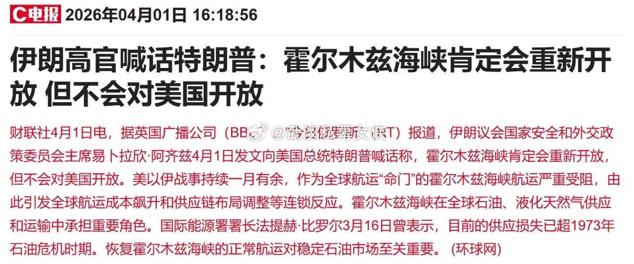 二是伊继续喊话, 霍尔木兹海峡肯定会重新开放,但不会对美国开放;