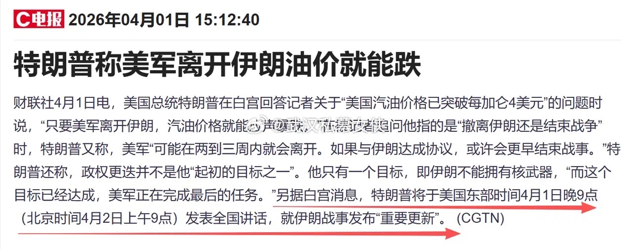 一是川普称美军离开之后,油价就会下跌,而且确定了明天上午9点会发表讲话;