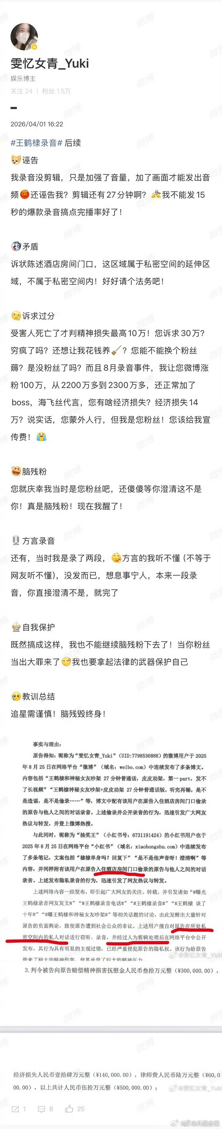 之前有网友录了 疑似王鹤棣酒店的录音 目前法院判决下来了 要求赔偿王鹤棣50万 王鹤棣起诉录音私生