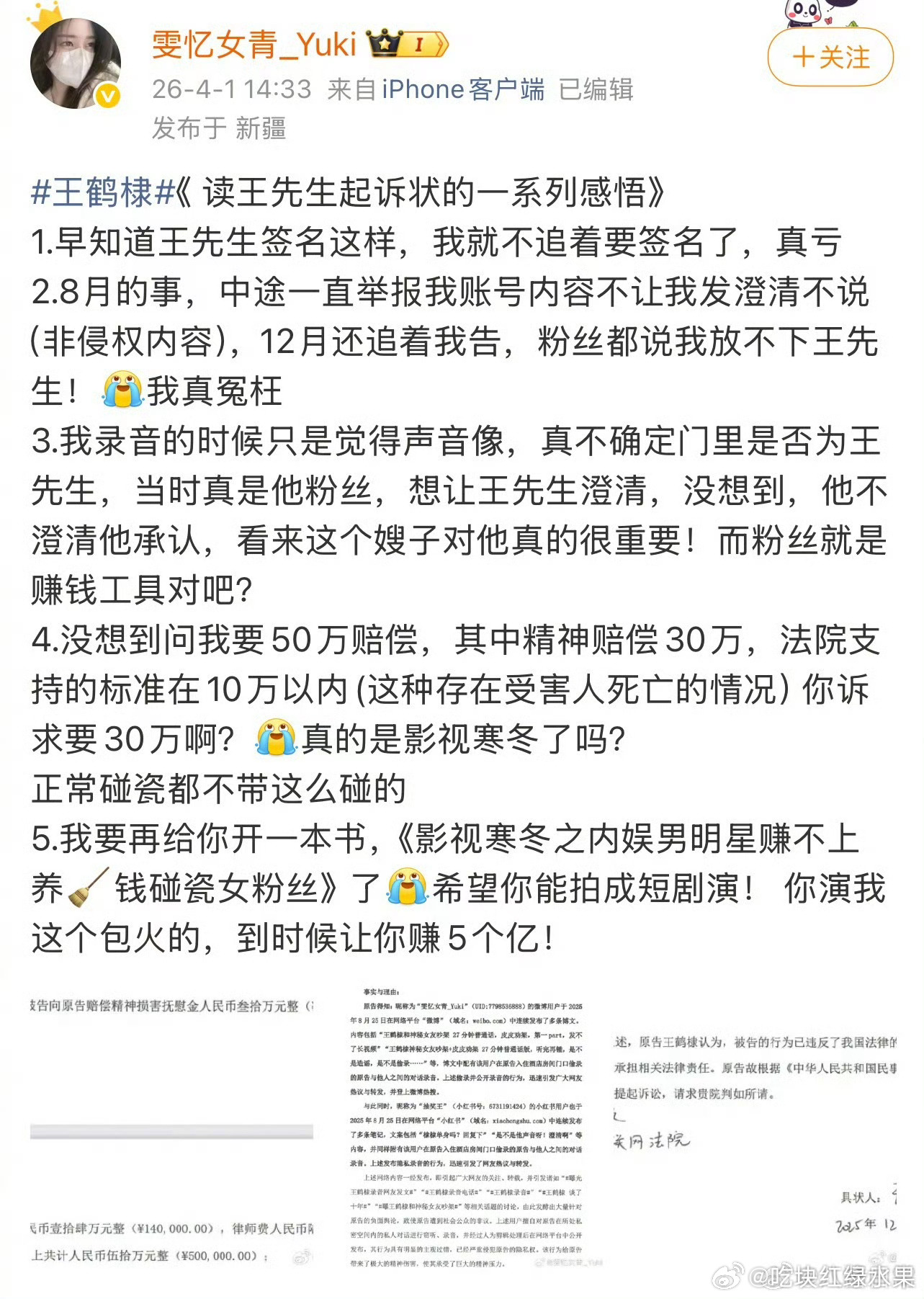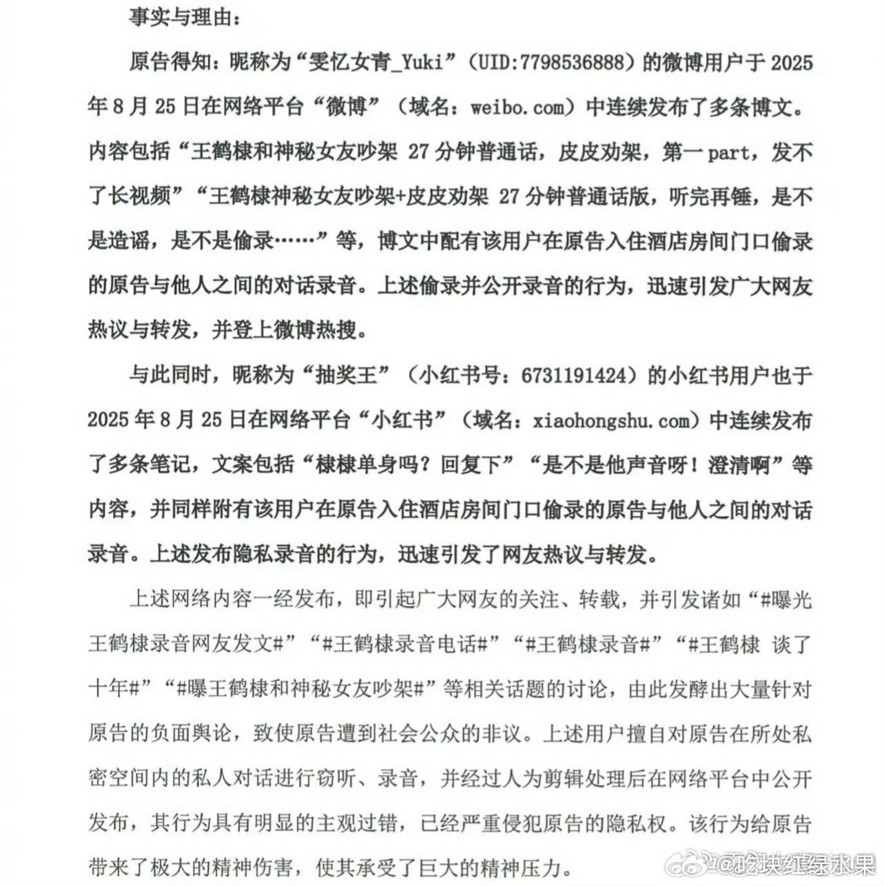 之前有网友录了 疑似王鹤棣酒店的录音 目前法院判决下来了 要求赔偿王鹤棣50万