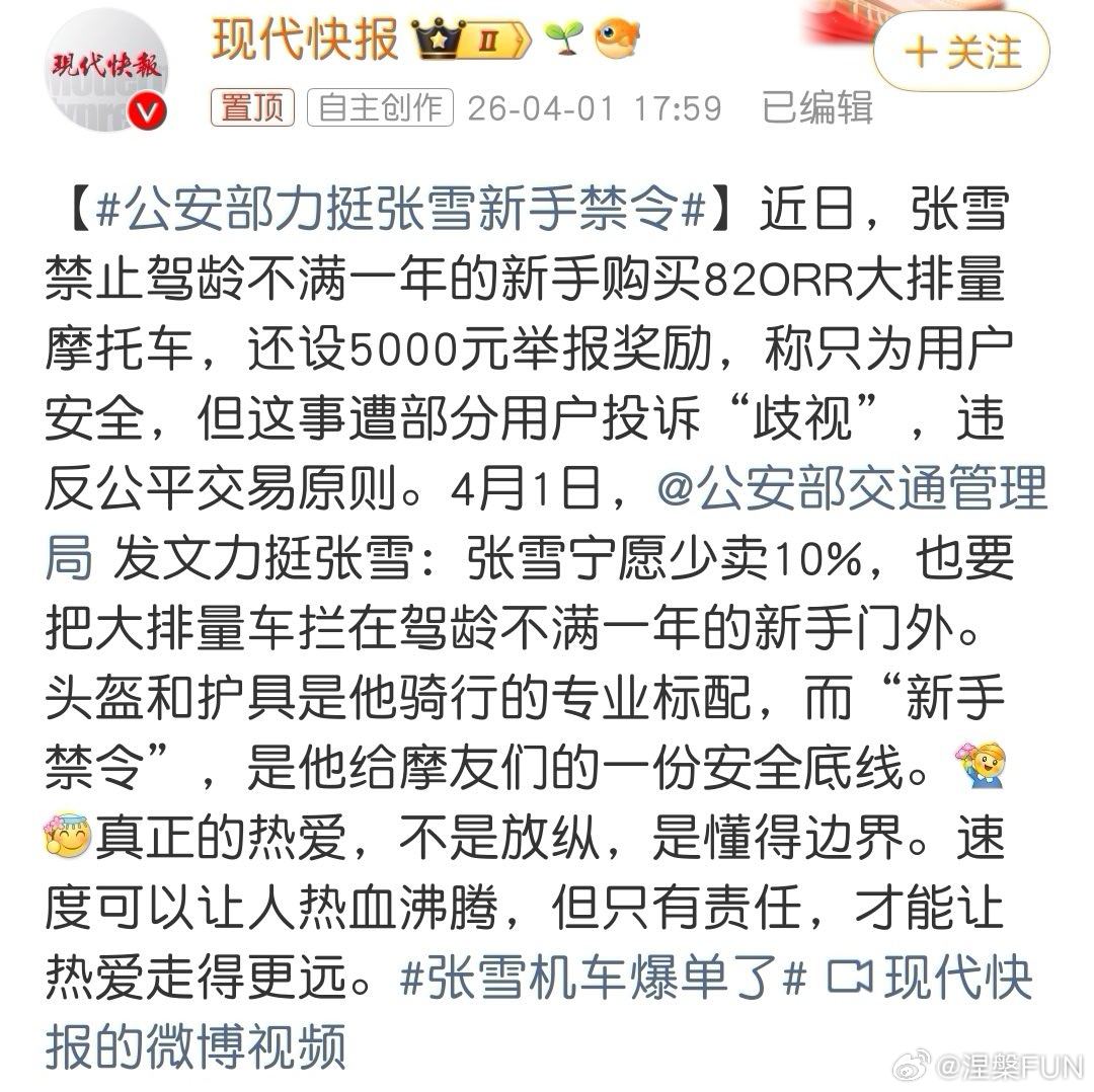 公安部力挺张雪新手禁令 我钦佩张雪不仅草根逆袭,而且自研发动机技术领先,更敬佩他的人品。