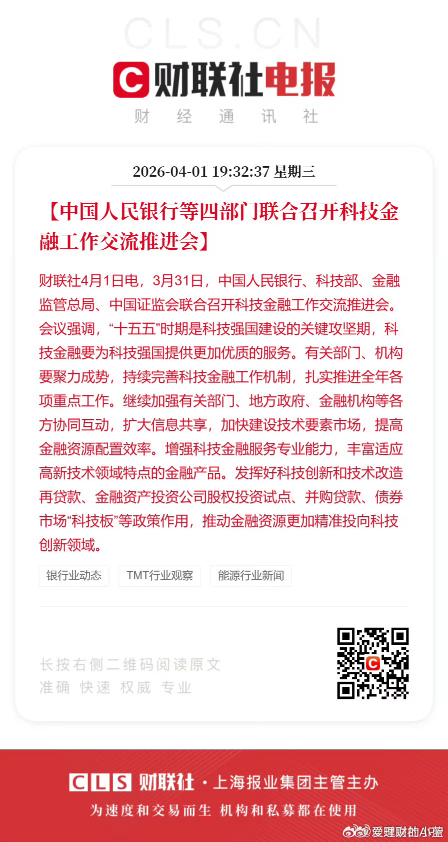 中国人民银行等四部门联合召开科技金融工作交流推进会。科技又有利好明天接着奏乐接着舞。