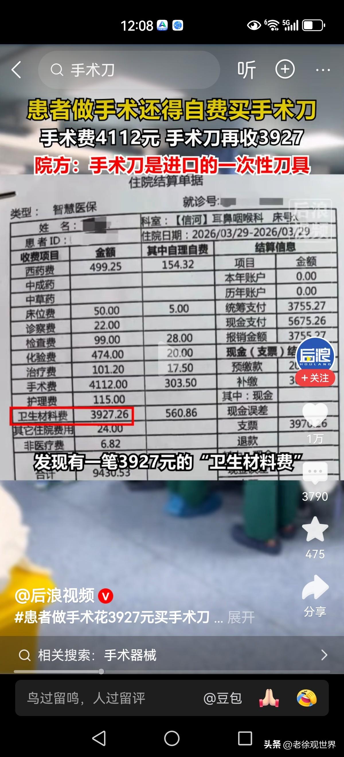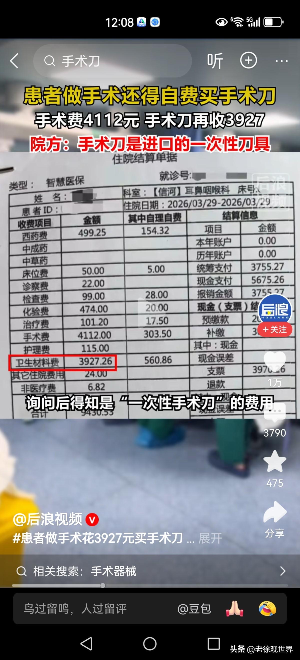 患者做手术还得自费购买手术刀片?看似挺别扭的,实则很普遍很现实。 感冒输液一次性输液器也是收费的。生孩子住院就连卫生纸也都是收费的,密密麻麻的账单比人都高!看病自费 牙科医疗费 手术账单 输液费用 手术医疗费 输液器耳钉 手术住院清单