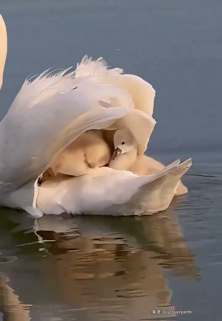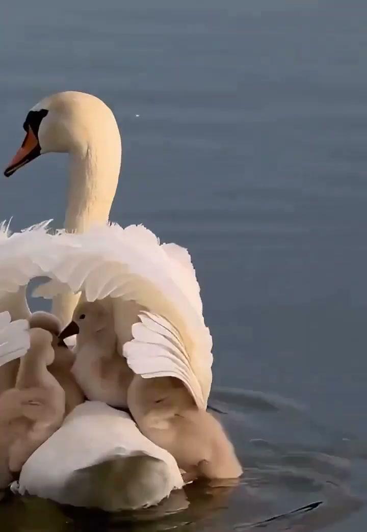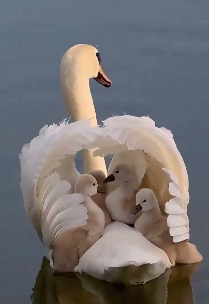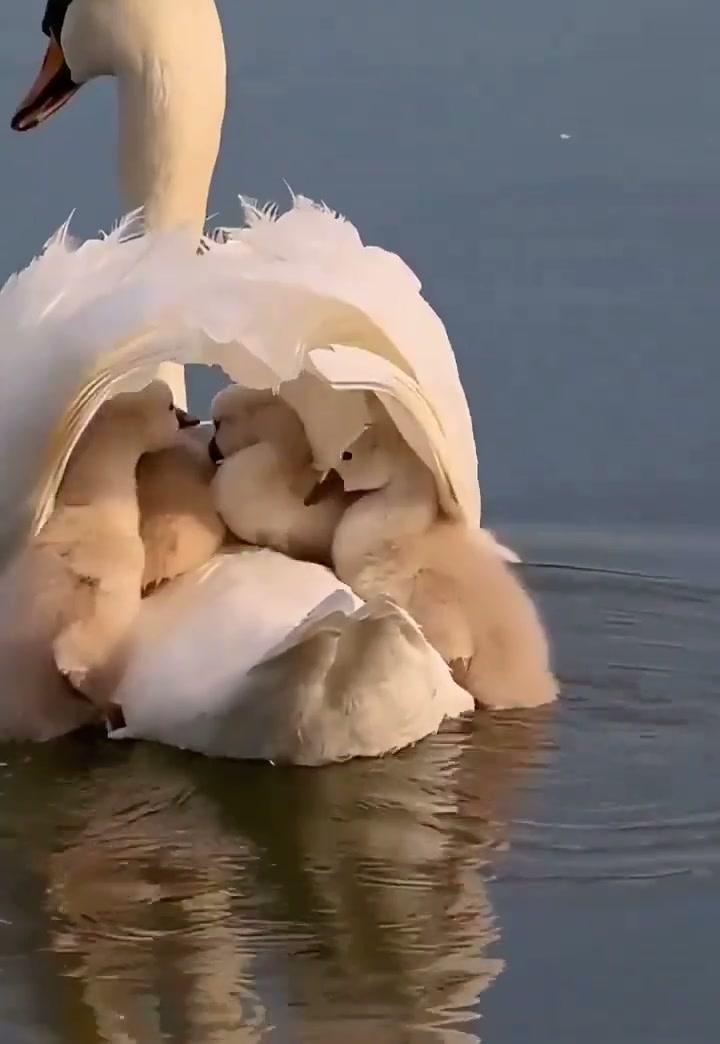 一只天鹅妈妈驮着几只小天鹅在水面游动,小天鹅们依偎在妈妈背上,看起来非常可爱。有人形容这就像自然界的校车,但比校车更萌。天鹅通常被视为优雅的鸟类,这种场景展现了动物界的母爱本能,让人感受到生命的美好与和谐。