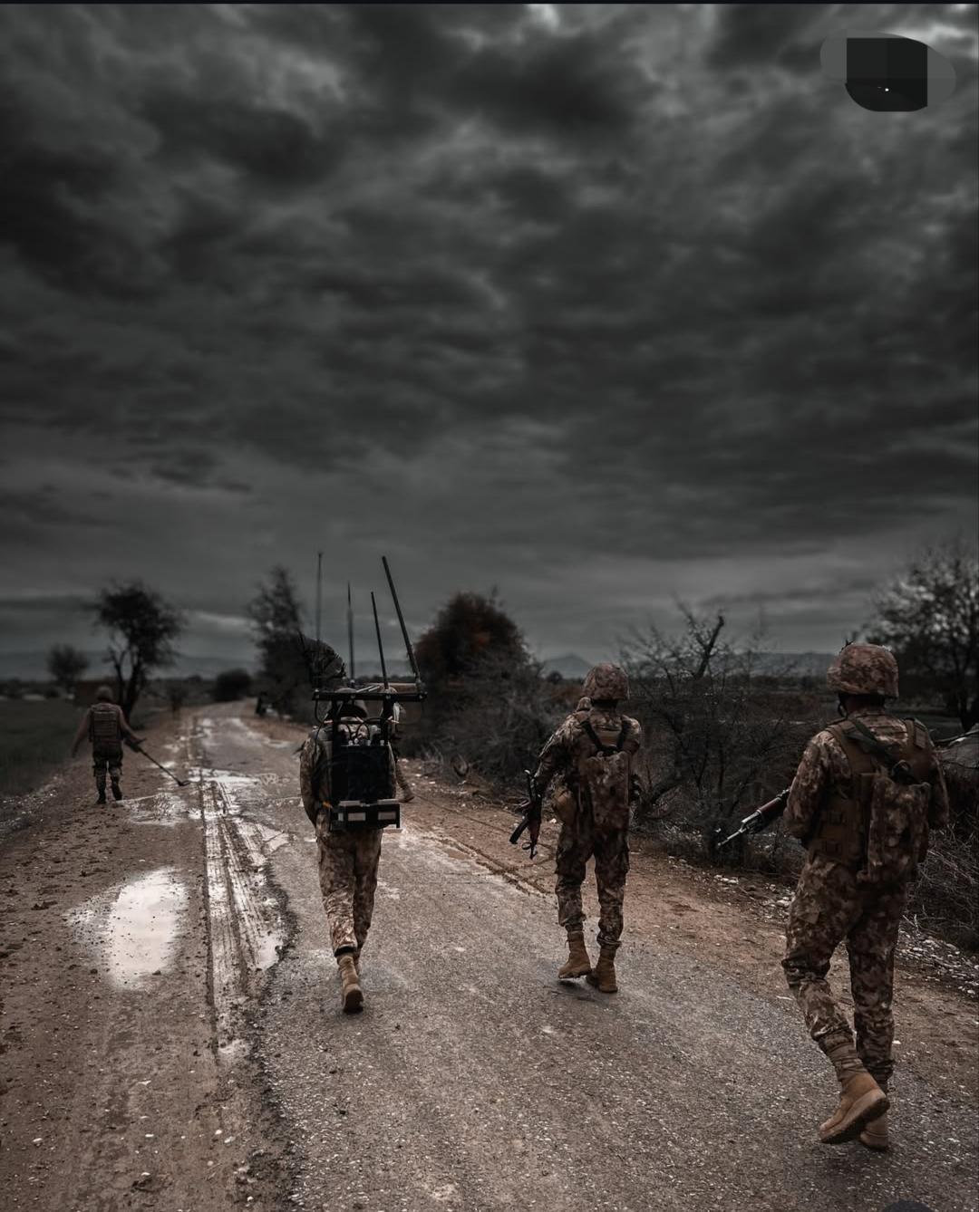 2025年3月26日,巴基斯坦军队巡逻时搜索简易爆炸装置,天空云层诡异如油画,带有《潜行者》游戏氛围。士兵装备较轻,包括NIJ IV级防弹背心、背包、水袋、护膝护肘、火箭筒携带器和手枪套等标准装备。