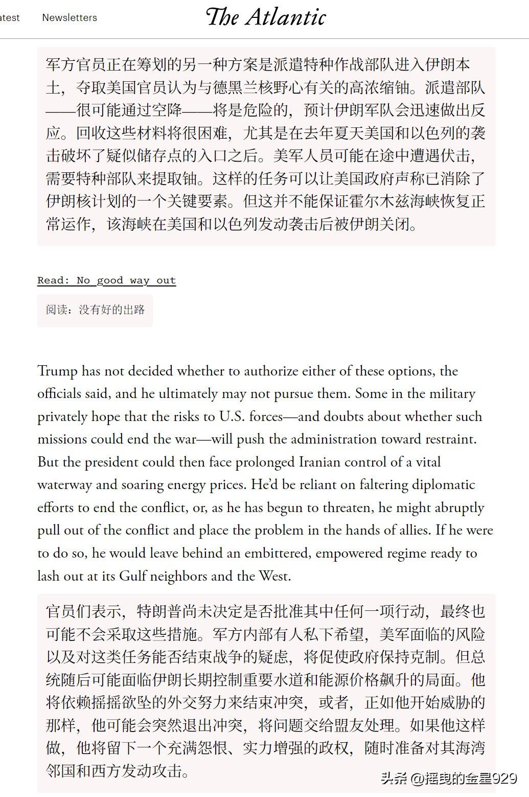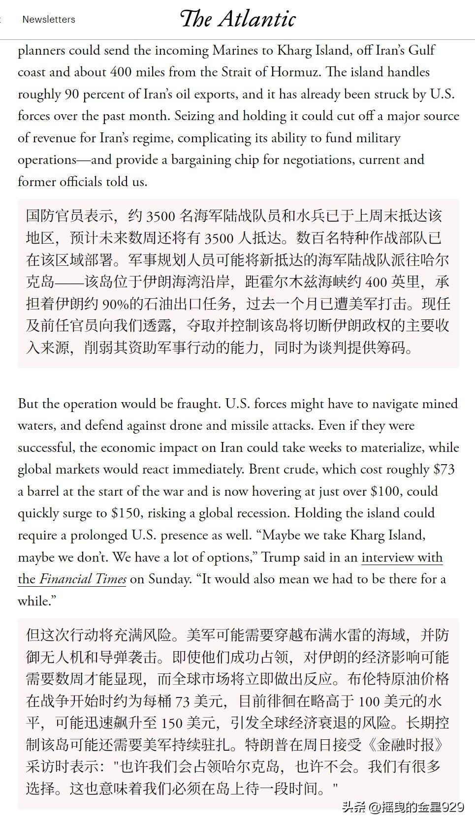 夺岛,夺浓缩铀,美军地面部队蓄势待发——《大西洋月刊》报道称,美国军方官员正策划对伊朗发动两次可能的地面攻击行动。 报道称,美国军方官员正在计划对伊朗发动两项潜在的地面袭击: 一是针对伊朗能源工业中心,经济命脉哈尔克岛。 另一项,旨在夺取浓缩铀以阻碍伊朗的核发展计划。 报道称,约3500名海军陆战队员和水兵已于上周末抵达该地区,预计未来数周还将有3500人抵达。数百名特种作战部队已在该区域部署。 但行动的权利依然由特朗普决定。 对于夺岛,美国总统特朗普此前依然表示,也许会占领哈尔克岛,但也许不会。有很多选择。但一旦占领哈尔克岛,这也意味着必须在岛上待一段时间。 报道称,这将给美军带来巨大风险。 而另一边,报道称,美国军方官员正在筹划派遣特种部队进入伊朗本土,夺取伊朗的浓缩铀。 主要以派遣部队,极大可能通过空降方式,迫降到浓缩铀所在地,但这同样是危险的,预计伊朗军队会迅速做出反应。 报道称,美军人员在这一行动中,可能在途中遭遇伏击,需要特种部队来实施夺取浓缩铀。这样的任务可以让美国宣布,“彻底消除了伊朗的核计划” 但报道称,无论上述两点成败如何,这并不能保证霍尔木兹海峡恢复正常运作。 Ps:特朗普可能两者同步进行,甚至不仅仅是哈尔克岛,而有可能去夺取占领海峡附近的岛屿,并且同时渗透突袭去夺取浓缩铀。 无论两种方案哪个成功,特朗普都有“赢”的口号进行宣传, 一是可以宣布彻底断了伊朗核计划。 二是成功夺岛。 若夺取浓缩铀失败,特朗普也可下令摧毁伊朗哈尔克岛的能源设施,以及其他能源设施,即:摧毁了伊朗经济命脉。 届时,只需再多吹嘘战绩,吹嘘摧毁了伊朗导弹设施,防空系统,海军,空军,伊朗将不再有威胁,即可全身而退… 而“夺取浓缩铀”这事,压根没有这回事,完全可以不提。