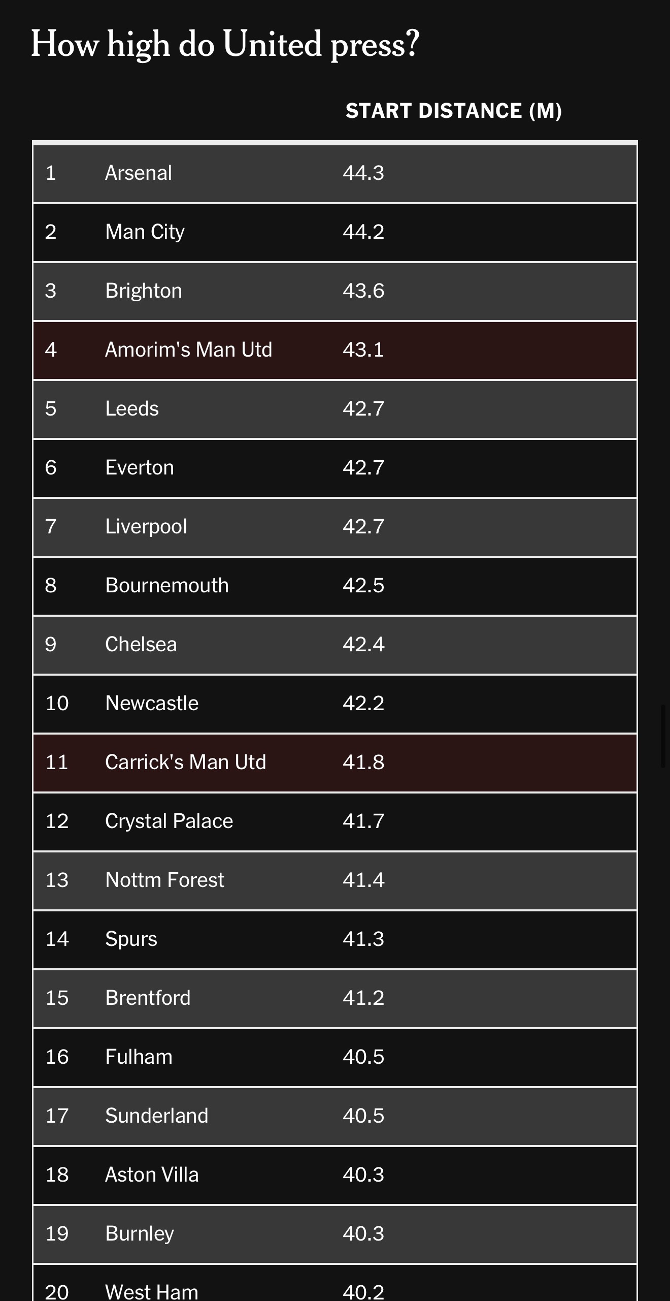给对手的绝对机会阿莫林每场2.2次,在卡里克时代则下降到1.3次。
