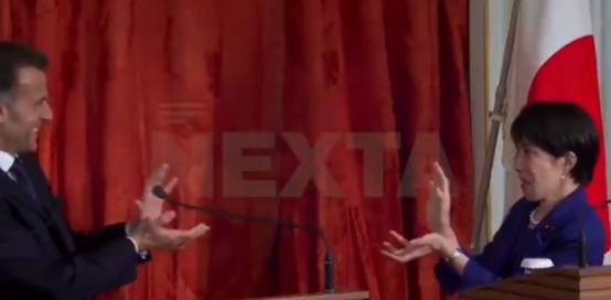 【马克龙和高一进入动画模式】埃马纽埃尔·马克龙和高市早苗在东京举行的联合新闻发布会上以轻松愉快的方式结束:高市早苗摆出了《龙珠》中的“龟派气功”姿势,马克龙也跟着做了,引得众人大笑,随后两位领导人对着镜头微笑。