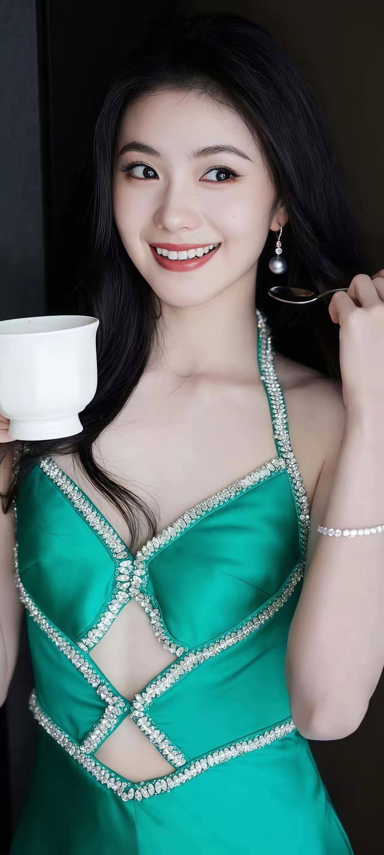绿衣美人捧玉杯,红唇轻启话芳菲。
