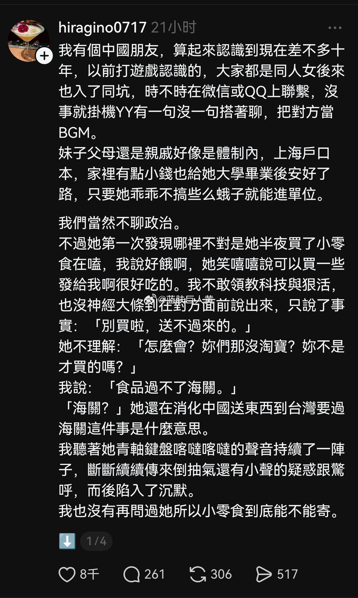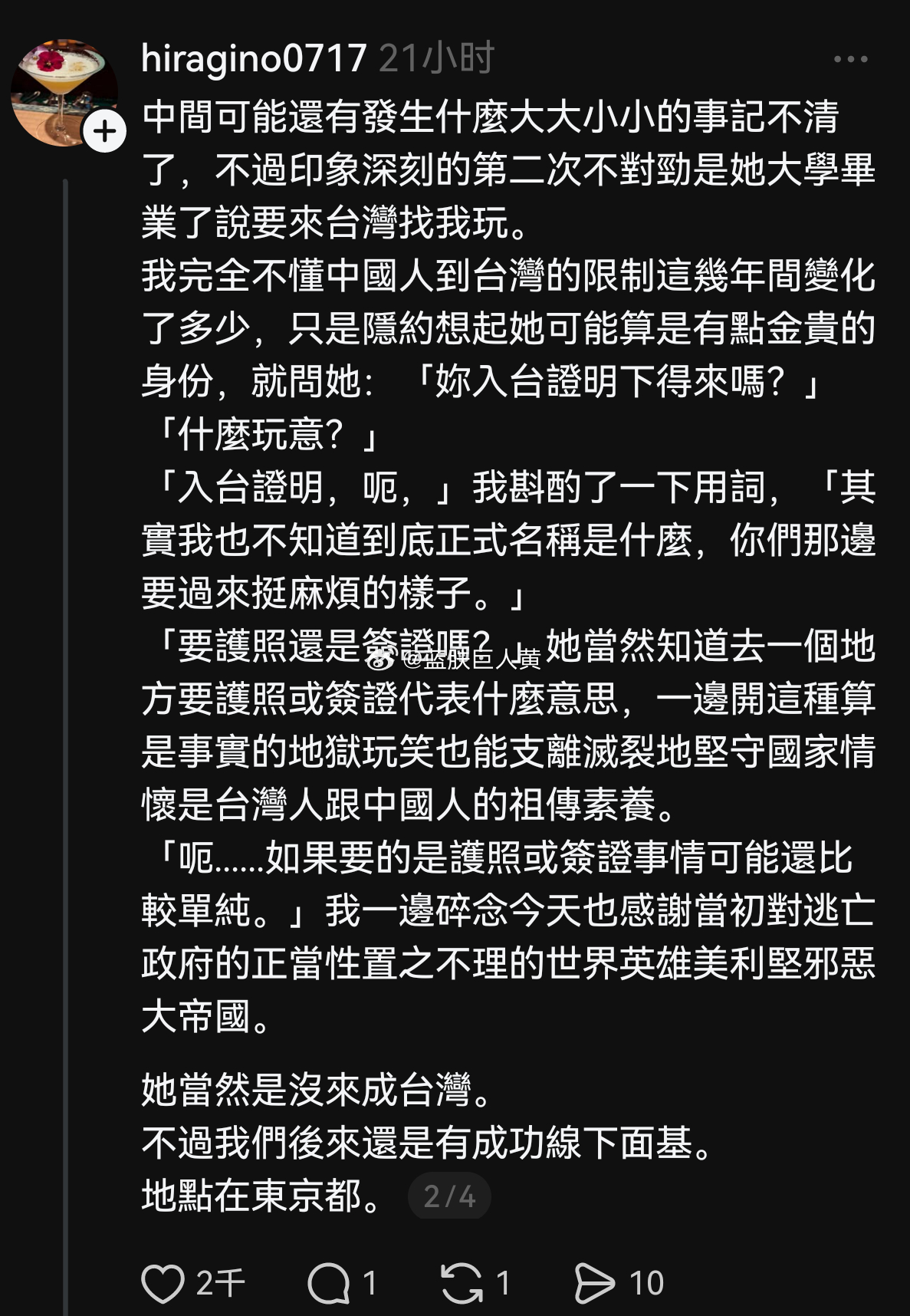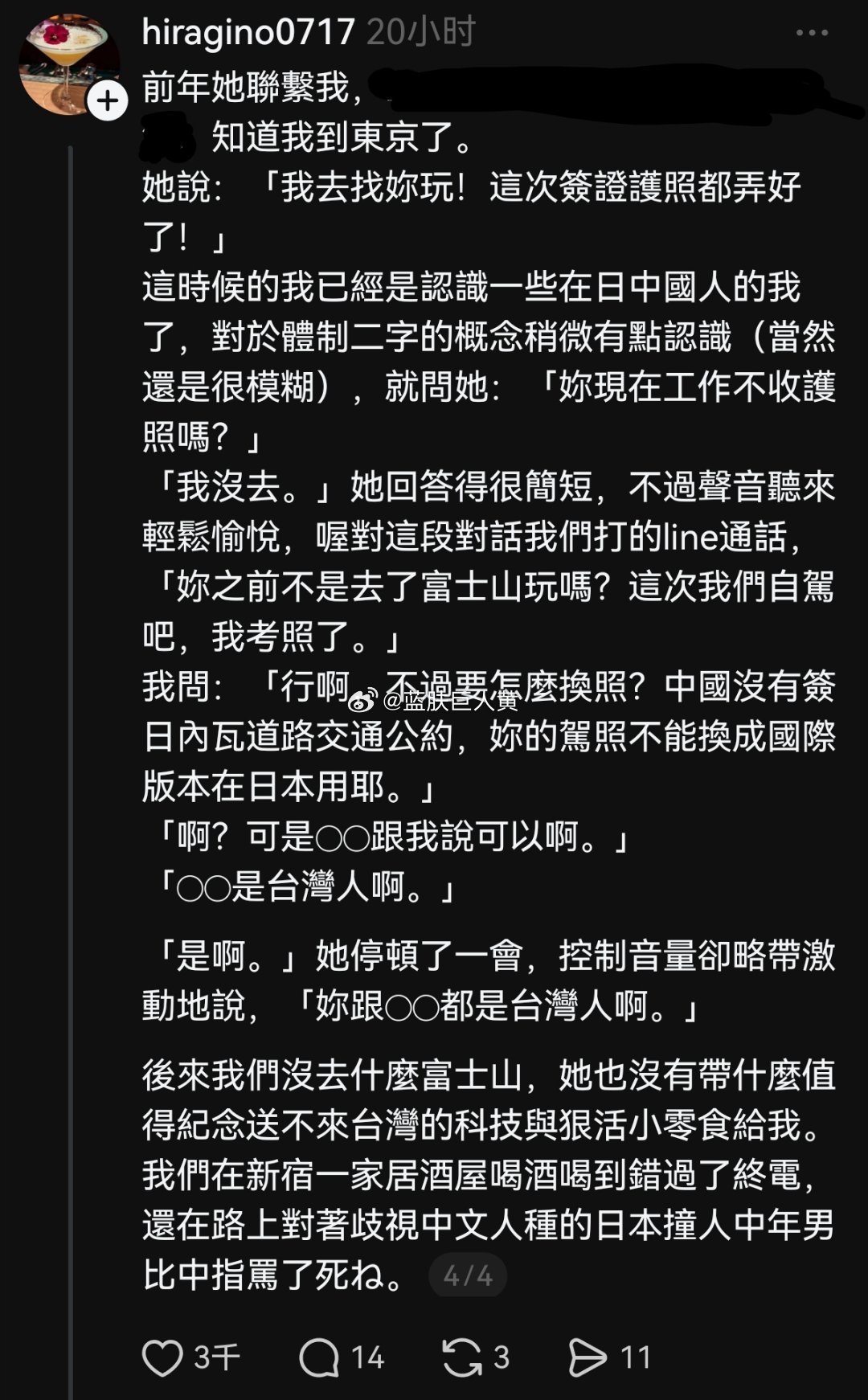 (如果不是编的,那她这个朋友蛮可怜的,认识了十年,这个台湾人还是看不起她)