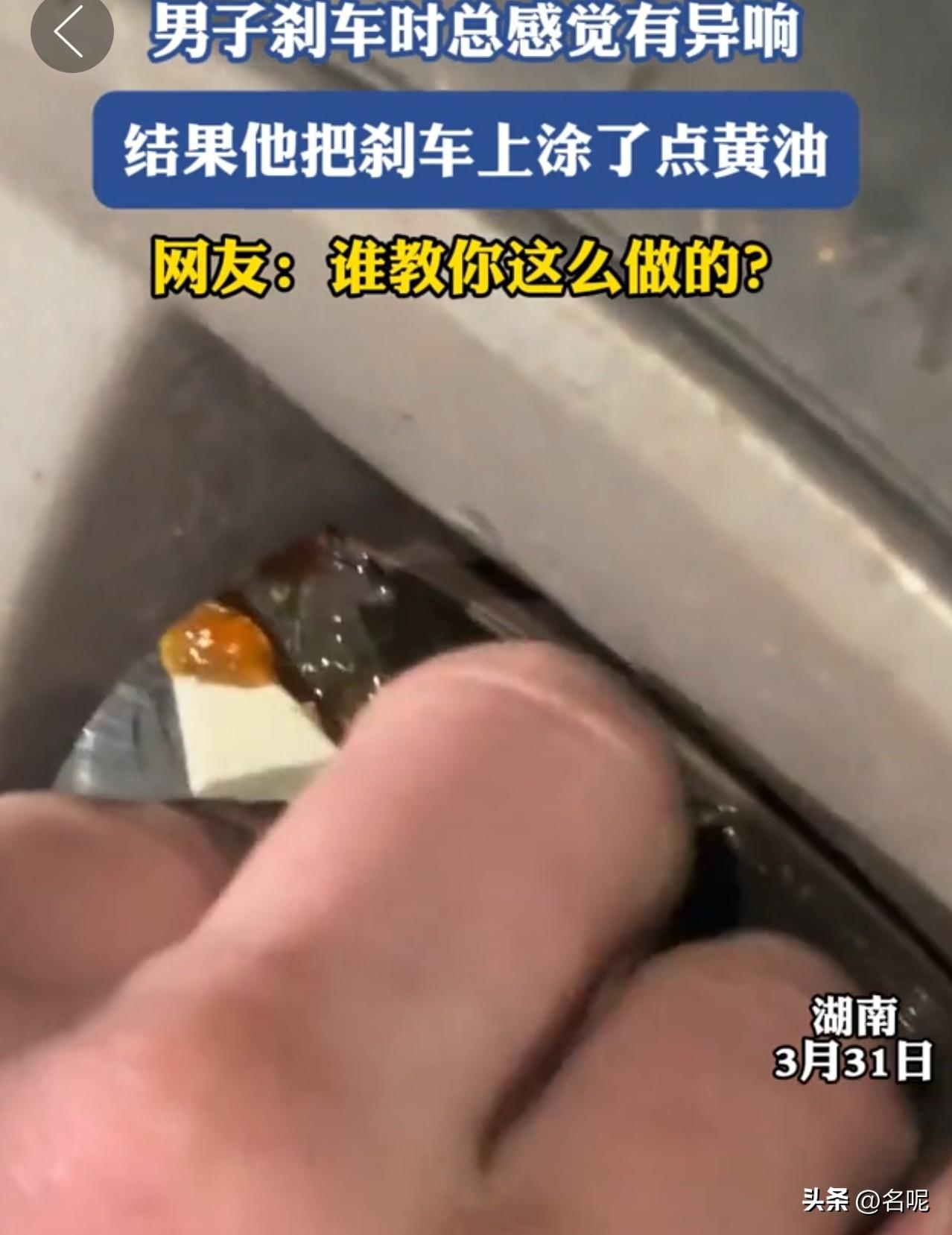 不怕聪明人算计,就怕蠢人灵机一动! 湖南,一男子刹车时总感觉有异响,结果他在刹车上涂了点黄油。这操作让人看傻眼了! 这哪是修刹车,分明是在制造“溜车”的缘分啊!简直就是嫌命活得太长,打算见上帝啊! 刹车异响本来大概率是刹车片磨薄、进沙子、卡钳问题,随便查查都知道不能抹油。 虽然黄油能让东西更顺滑,但用在刹车上那可是致命操作!原理就像鞋底抹了油没法站稳,刹车片上涂了黄油,摩擦力直接归零。一脚下去,车根本刹不住。 这种“自作聪明”的操作,比不会修还吓人,纯属给自己制造重大安全隐患。