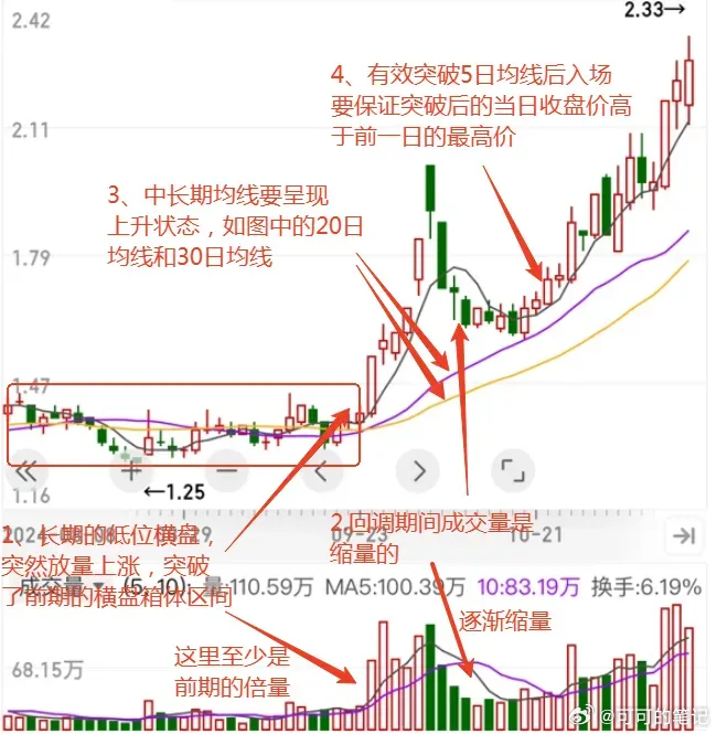 拉升回踩时买入是很多朋友喜欢的一种操作模式。那么怎样的回踩,才是最好的进场机会呢。并不是所有拉升回踩后都会开始第二波,有些会跌回原形,而有些会走第二波。这里分享一个拉升回踩买入的模式,分四个步骤,如下图这个案例所示:一、首先如图箭头一所示股价在一段很长时间的横盘后,出现了一波放量拉升的行情,突破了横盘的箱体区。这波拉升的目的主要是突破前面箱体。二、拉升之后出现了回调。这里需要注意的是,这波回调要是逐渐缩量的。如图中箭头二所示,越往下调,成交量越小。三、在整个调整区间,其中长期的均线要保持上升的状态。如图中箭头三所示的20日均线和30日均线都是保持上升趋势的。四、K线有效突破5日均线的时候入场。所谓有效突破是指,突破5日均线后,其收盘价要高于前一天的最高点,把前面的套牢盘给释放了。a股行情