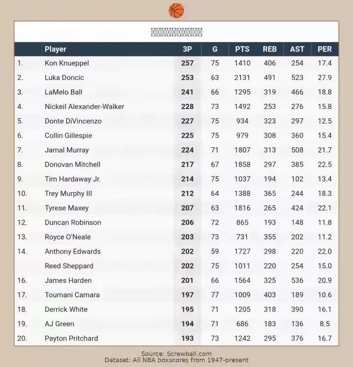 东契奇再不发力,联盟那些三分射手的面子都挂不住了,本赛季的三分命中数榜单第一的位置一直被克尼普尔这个新秀霸占着,目前东契奇以253记排第二,距离克尼普尔的257记还差4记,最终东契奇能不能实现翻盘还不得而知,但是希望很大!
