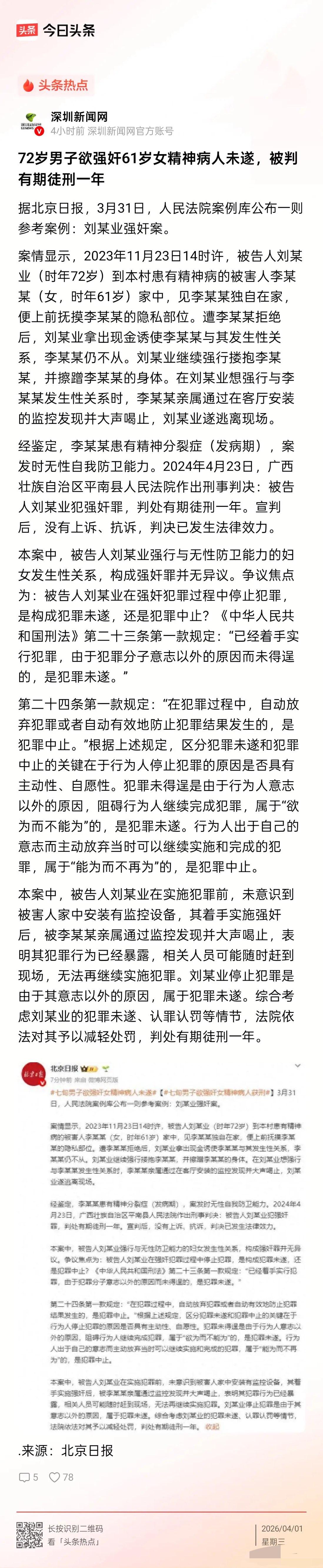 广西平南七旬老汉性侵精神病女子案评析 “老而无德!”广西平南,一七旬老汉为满足私欲,闯入61岁患有精神病的女子家中,意欲与之发生亲密关系。女子拒绝后,老汉又拿现金进行诱导,女子仍然不从,老汉便使用强制手段,想要借此达成目的。所幸女子的家人通过监控看见了这一幕,遂呵斥制止,老汉这才未能得逞。事后,女子的家人赶紧报了警,老汉最终因犯qj罪获刑1年,如何评价此案? 先说说这个七旬老汉的所作所为,真的让人打心底里唾弃。都说年纪大了更该懂规矩、守底线,可他偏偏反其道而行,把歪心思动到了弱势群体身上。 被害女子61岁,还患有精神病,案发时正处于发病期,经专业鉴定,她根本没有性自我防卫能力。这样的人,本身就需要旁人多加呵护,可老汉却瞅准她独自在家的时机,直接闯入家中,一开始就没安好心。 被女子直白拒绝后,他没半点收敛,反而拿出现金想用钱收买。在他眼里,似乎金钱能摆平一切,却没想过自己的行为,是在践踏一个人的尊严,更是在触碰法律的红线。 见金钱诱惑没用,他干脆撕破脸,直接动用强制手段,完全不顾对方的反抗和恐惧。要不是家人装了监控,及时发现并大声喝止,后果简直不敢想。 很多人看到判决结果,会觉得一年刑期是不是太轻了,其实这里面有明确的法律依据。法院认定老汉属于犯罪未遂,而非犯罪中止,两者的量刑差别很大。 他停止犯罪,不是自己良心发现、主动放弃,而是被家人通过监控发现,行为彻底暴露,没办法再继续下去,属于“想做却做不成”的意志以外的原因。 法律上,对于犯罪未遂,会比照既遂犯从轻或减轻处罚,再加上老汉后续认罪认罚,法院才综合考量判处一年有期徒刑,这个判决是严格依照法律条文作出的,并非随意量刑。 这件事最让人唏嘘的,是“老而无德”这四个字。年纪从来不是违法犯罪的挡箭牌,更不是放纵私欲的借口。 不管多大岁数,都该守住道德和法律的底线,尤其是对待弱势群体,更该多一份善意和包容,而不是趁机欺凌、满足私欲。 精神病患者本就缺乏自我保护能力,家人安装监控的做法,其实是无奈之举,却也恰恰成了阻止悲剧发生的关键。这也提醒我们,对于身边的特殊群体,一定要做好周全的防护,不给不法分子可乘之机。 也有人会说,老人年纪大了,判刑一年会不会太严苛?可法律面前人人平等,从来不会因为年龄就网开一面。 他犯下的是强奸罪,侵害的是他人的人身权利,即便年事已高,也要为自己的恶行承担相应的法律责任。这既是对被害人的公道,也是在告诫所有人,无论老少,只要触犯法律,就必然会受到惩罚。 反观这起案件,更折射出部分人道德观念的缺失。年纪增长本该带来阅历和修养的提升,可有些人却随着年纪变大,越发无视公序良俗,把自私自利发挥到极致。 这种行为不仅毁了自己的名声,让家人蒙羞,更给被害人及其家庭带来了难以磨灭的心理伤害。对于精神病患者来说,这种侵害带来的心理创伤,远比普通人更难愈合,家人后续还要花费大量精力去安抚、疏导。 法律的判决,是对恶行的惩戒,可道德上的谴责,更是对这类行为的有力批判。我们始终要明白,尊重他人、敬畏法律,是做人最基本的准则,和年龄无关,和身份无关。 任何试图挑战法律底线、侵害他人权益的行为,最终都逃不过法律的制裁,也会被世人所唾弃。 各位读者你们怎么看?欢迎在评论区讨论。