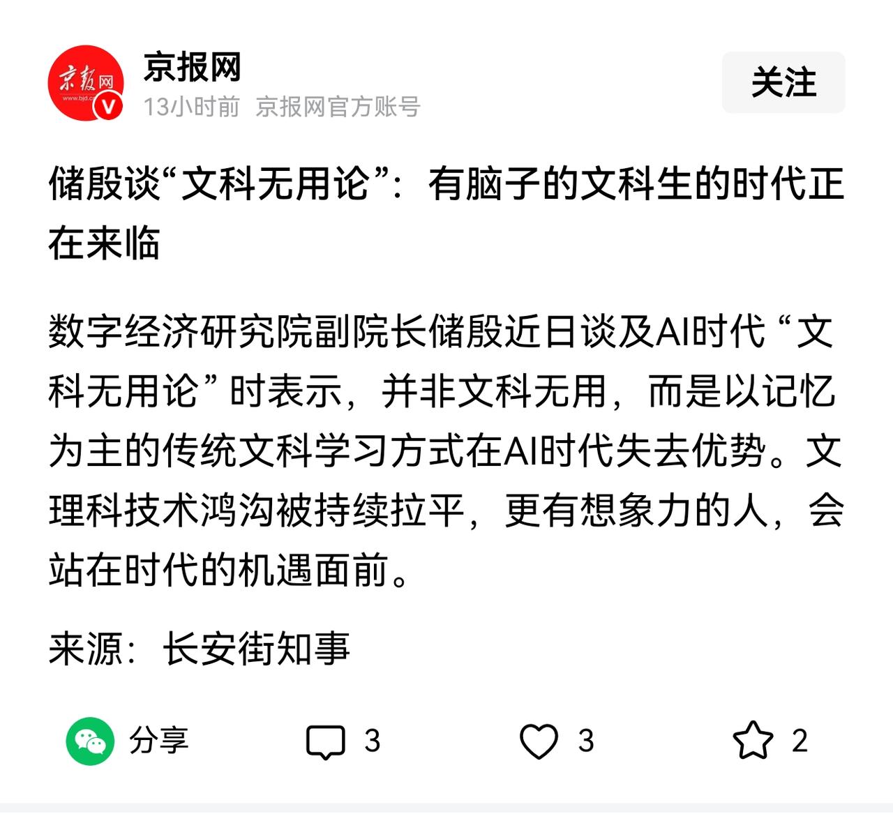 说“文科无用”,与盲目相信“文科无用”,都是没脑子。死记硬背的文科,当然无用,必将被AI替代。而培养思考力、想象力、人文素养的文科,在AI时代将大有作为。 事实上,学理工科的,如果只学习技术,也很快会被AI替代。只有具有思考力、观察力、表达力、沟通力、创新力的理科生,才不会被AI抢饭碗。 因此,在AI时代,还谈论文理分科,已无意义,文理交叉、融合是大势所趋,而人才培养,必须关注人本身的发展。