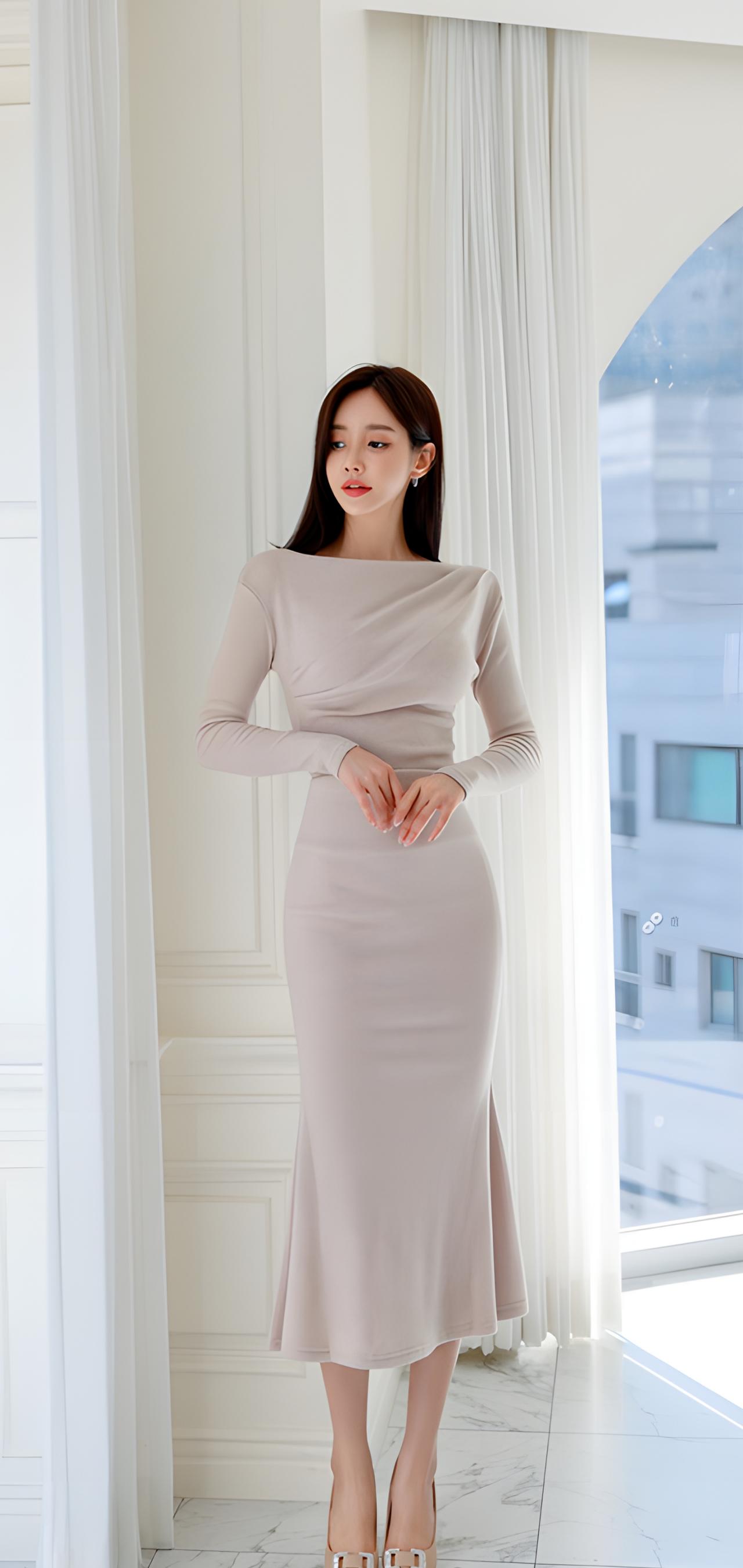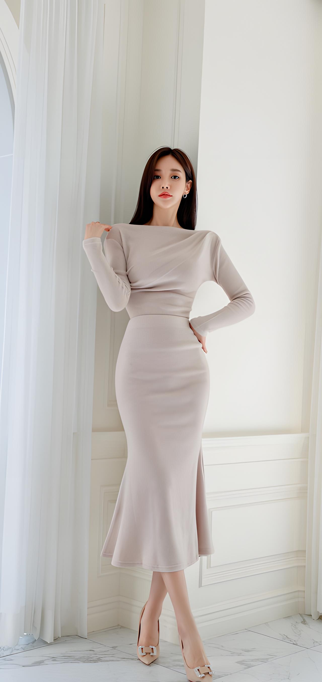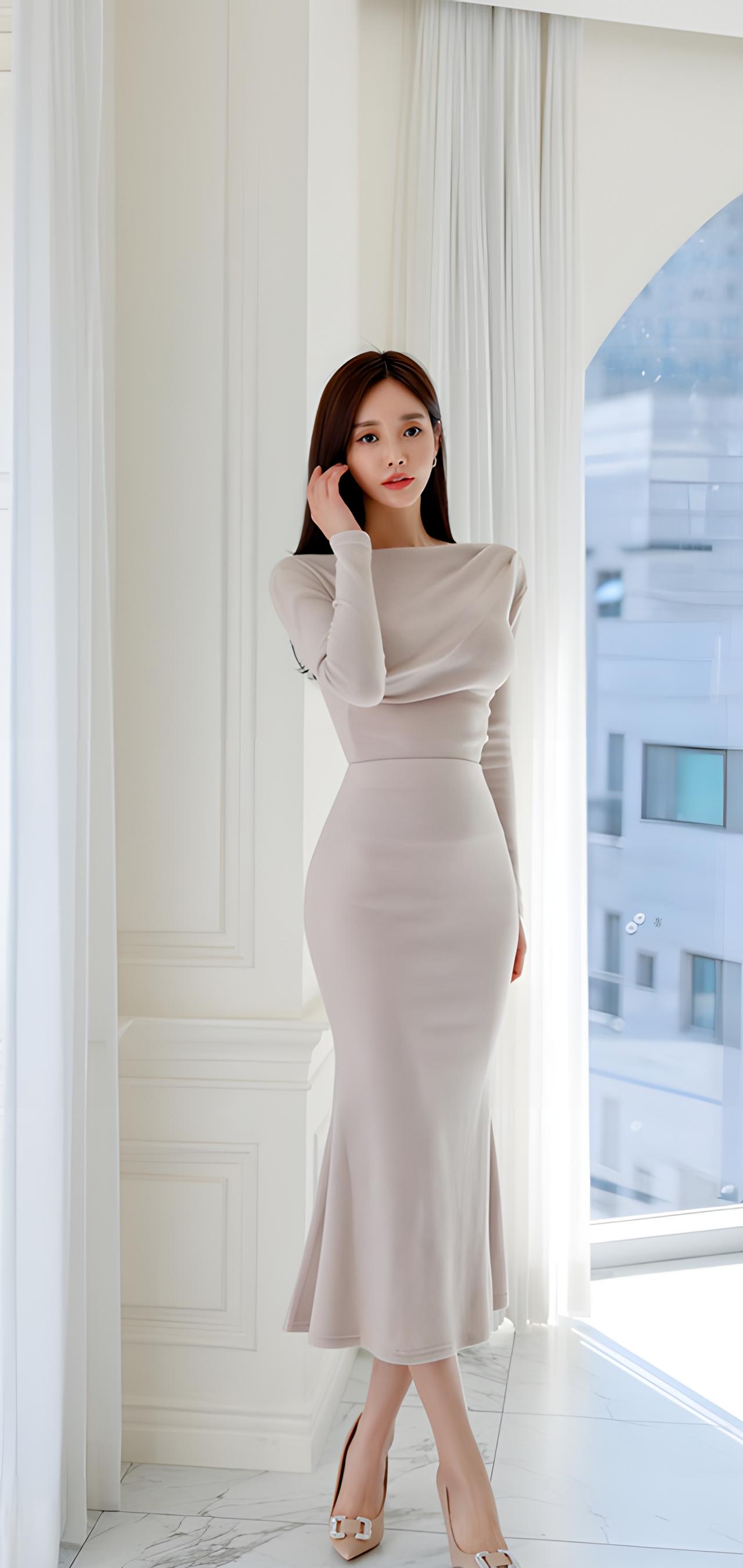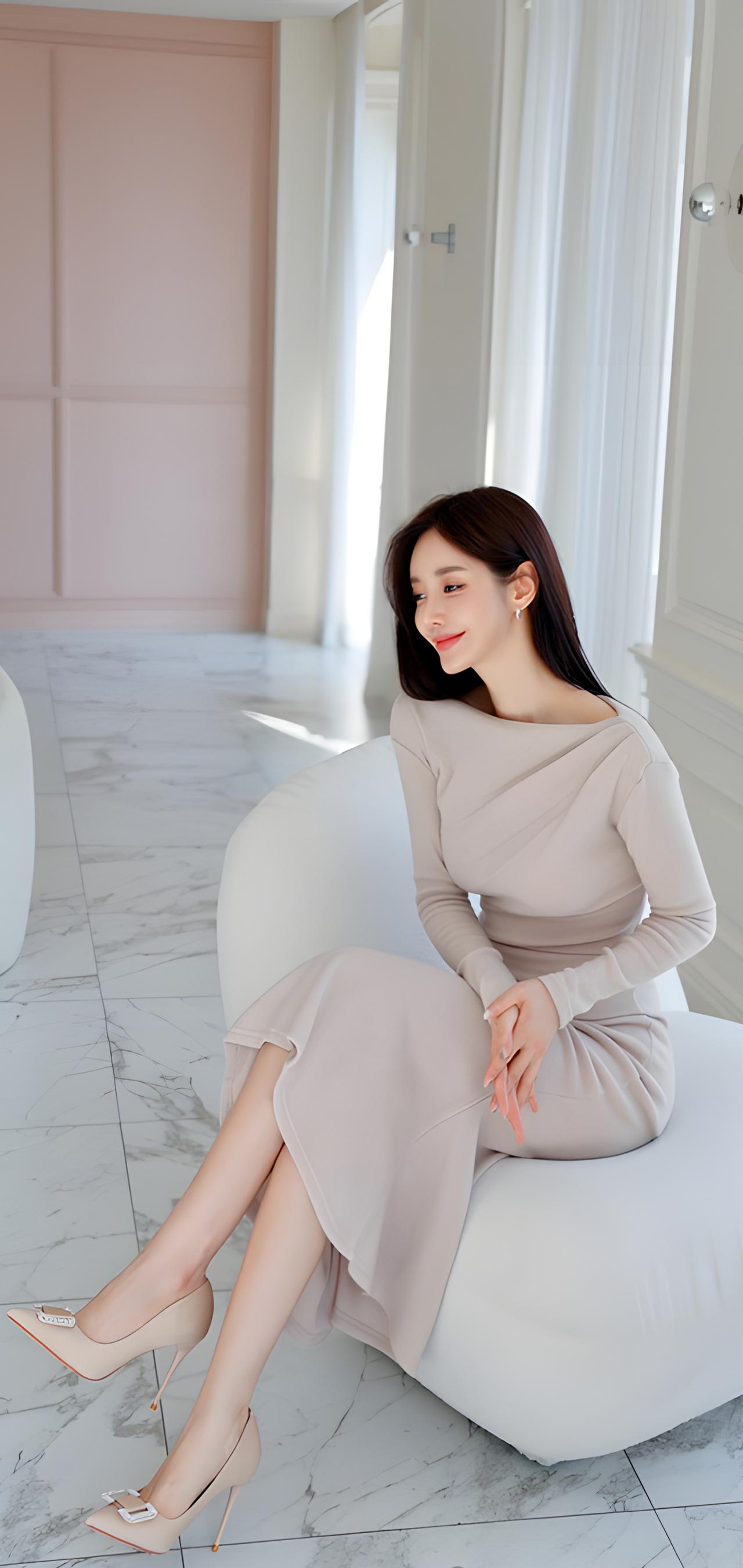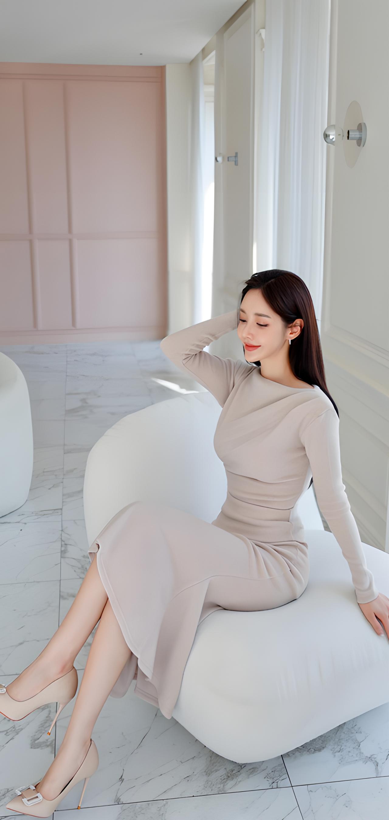 优雅气质穿搭,浅粉色连衣裙搭配高跟鞋,坐在白色沙发上,背景是现代都市风景。