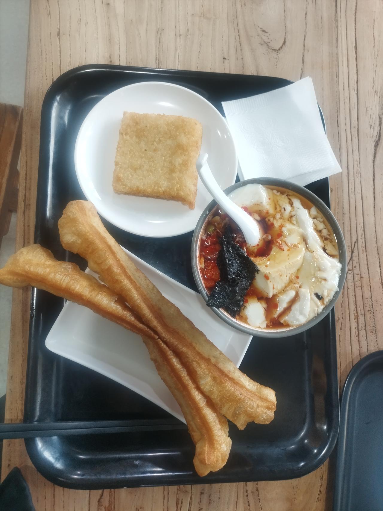 在上海宝山杨行地区有这么一个平民餐厅,万科第五食堂!明天早上供应很多特色早点,价格亲民。如图一根油条,一个粢饭糕,一碗豆花,只有7元钱。不知道你认为价格怎么样?