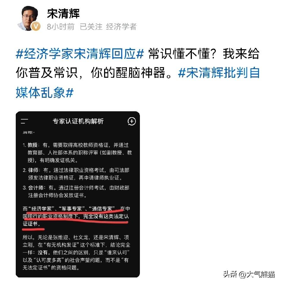 原来身份都是自己给的? 宋清辉回应了对“经济学家”称号的质疑,他认为经济学家是一个职位,而非严格学术职称。 还举例了其他的大v如张维迎,杜文龙,项立刚等人的所谓专家称号,根本就没有这方面的认定证书,之所以这么称呼,是大家对这些人在某个领域专业度的认可。 而自己长期做经济研究、出书、还有被多家媒体采访,这就是市场对这个“职位”的认可。 大静说,宋清辉说的有道理吗?