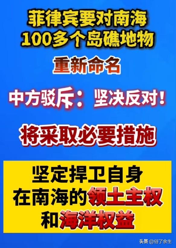 菲律宾要对南海100多个岛礁地物重新命名,中方驳斥:将采取必要措施 菲律宾近期宣布要对南海100多个岛礁地物重新命名,中方对此表示强烈反对,并强调将采取必要措施维护国家主权。南海诸岛是中国领土不可分割的一部分,这有着充分的历史和法理依据。菲律宾的这一行为,是对中国主权的严重侵犯,也不利于地区的和平稳定。在南海问题上,中国一直致力于通过和平谈判解决争端,但这并不意味着中国会放弃自己的主权。我们希望菲律宾能够认清形势,停止一切损害中国主权的行为,回到对话协商的轨道上来。