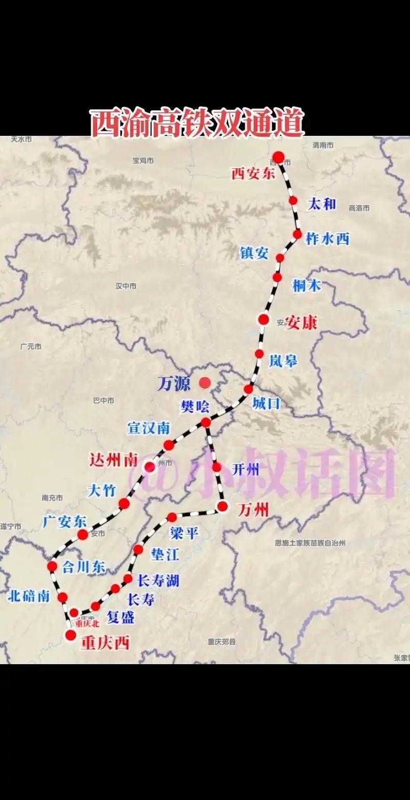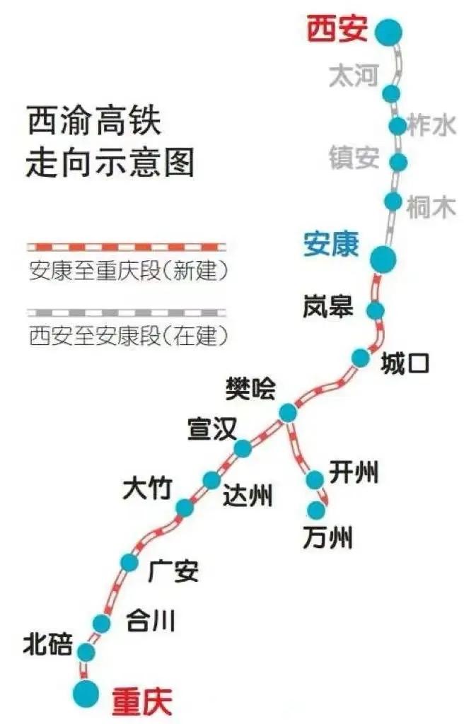 西渝高铁 西渝高铁(西安至重庆高速铁路)是国家“八纵八横”高铁网中京昆通道与包(银)海通道的重要组成部分,全长约739公里,设计时速350公里,分西安至安康、安康至重庆两段建设,预计2028年建成通车 。通车后,重庆至西安的旅行时间将从目前的6小时缩短至2.5小时左右,实现“半日往返” 。 它将使重庆与西安真正进入“半日生活圈”,想象一下,早上在西安来一碗热气腾腾的泡馍,感受古城的历史韵味,中午就能到重庆涮上一顿麻辣火锅,体验山城的热辣风情。