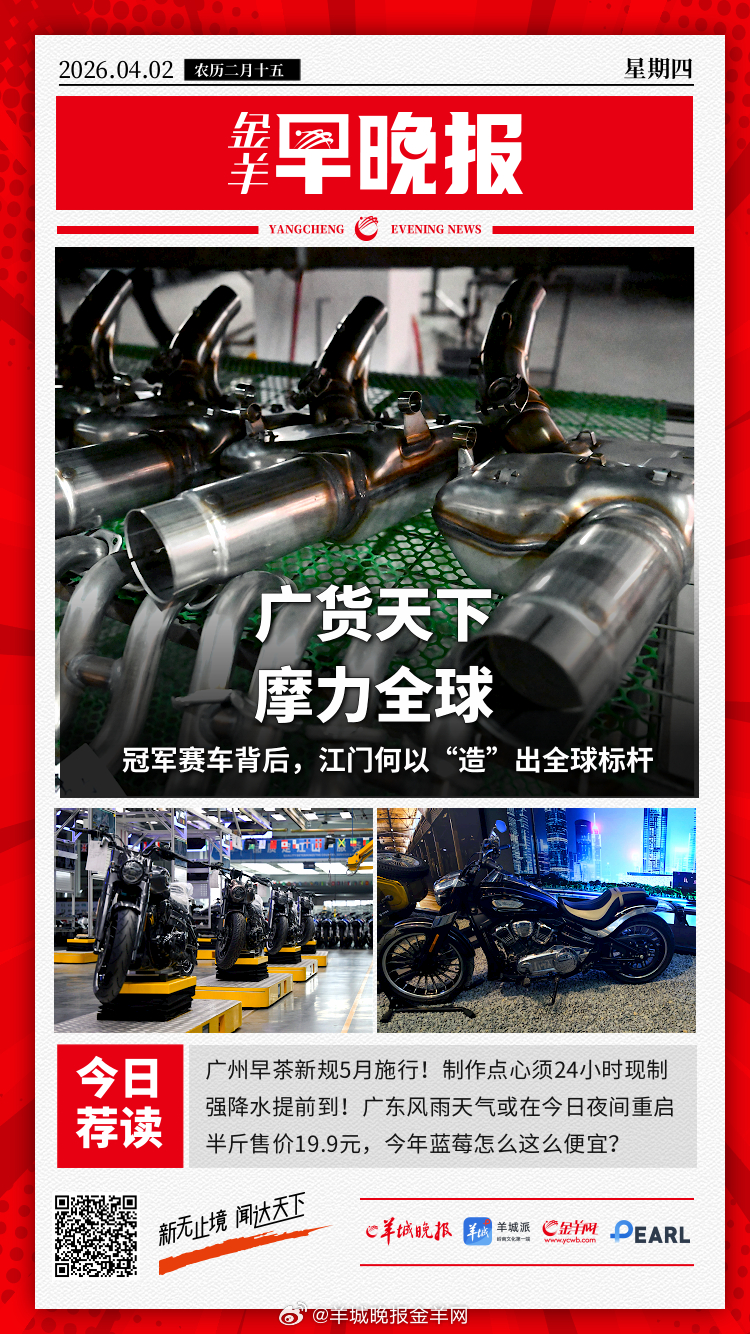 #金羊早晚报# 揭幕战6月12日3点!美加墨世界杯赛程出炉;可载重3.5吨的“无人空中重卡”来了!解码长鹰-8硬核实力;国家文物局:组织国有博物馆逐件清点馆藏文物,全面核实账物相符情况;警惕智能穿戴设备引发泄密事件,国安部披露多起案例详情;半斤19.9元,今年蓝莓怎么这么便宜?不能简单归为生产过剩;广州早茶新规5月施行!官方回应茶位费、现场制作等热话题;为早茶“预制菜”亮明牌!广州立法明确传统方式制作点心须24小时现制;广州加强民用无人机登记备案与安全管理,警方明确相关要求及飞行规范;一辆冠军赛车背后,江门摩托何以“造”出全球标杆?充电桩建设按下“快进键”,广东何以跑出绿色出行加速度?4月5日起国内航线燃油附加费涨5倍,提前“囤机票”还来得及吗?强对流+强降水将提前到!广东风雨天气或在今日夜间重启;#伊朗10分钟5波导弹袭击以色列##以色列遭开战以来最大规模导弹袭击# 热备战冷发声,美在中东军事行动何去何从,专家分析;美载人绕月飞行任务进入最后准备阶段;日本有识之士表示日官方应对其错误言行反省道歉。#国乒男线对德国3连败##在美出生即公民或彻底终结# 更多精彩报道,请扫码关注羊晚全媒体报道!