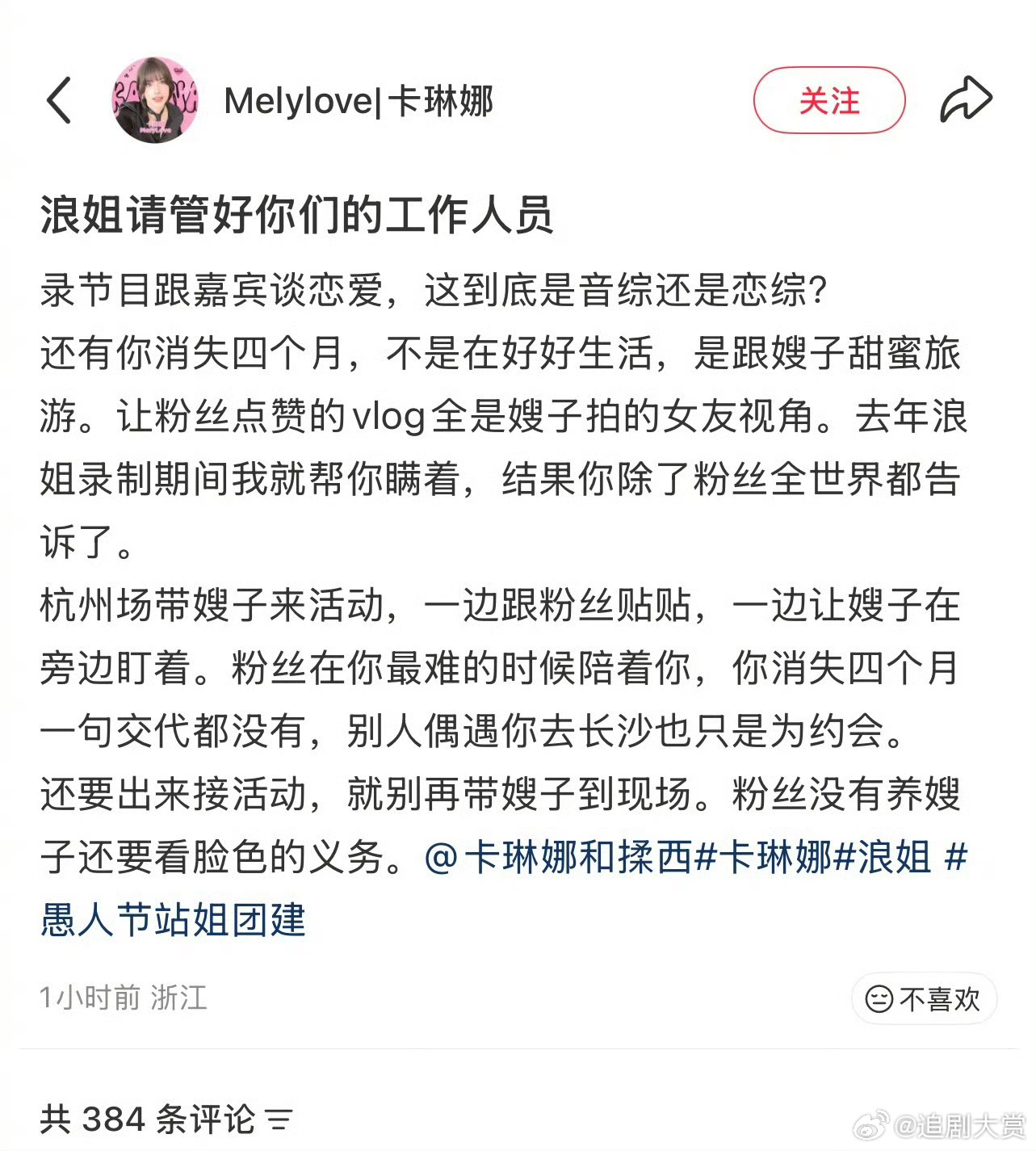 卡琳娜站姐喊话浪姐管好工作人员卡琳娜站姐喊话浪姐管好工作人员,说卡琳娜与浪姐工作人员谈恋爱