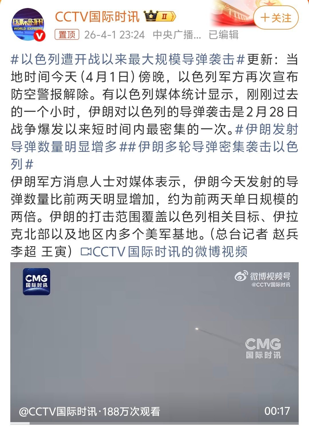 伊朗10分钟5波导弹袭击以色列以色列遭开战以来最大规模导弹袭击
