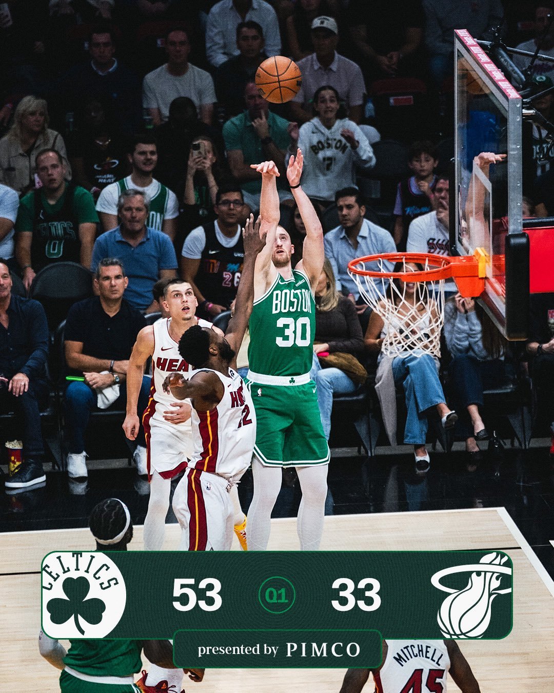 凯尔特人第一节狂轰53分,队史首节最高分。28投20中,其中三分15中11,只有2次罚球,而对手是...凯尔特人vs热火NBA