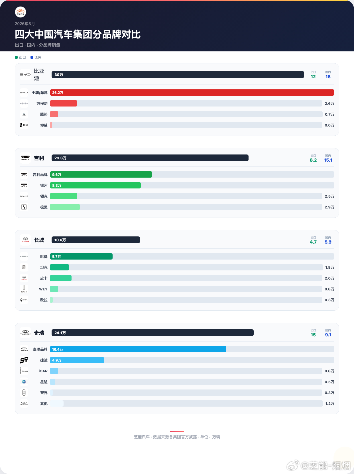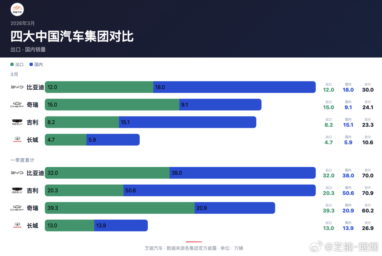 四大自主集团各有侧重:比亚迪出口增长强劲,奇瑞海外占比领先,吉利主打国内市场,长城内外销量更均衡。各品牌子产品线分化明显,格局持续调整。