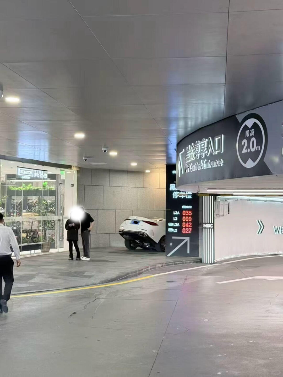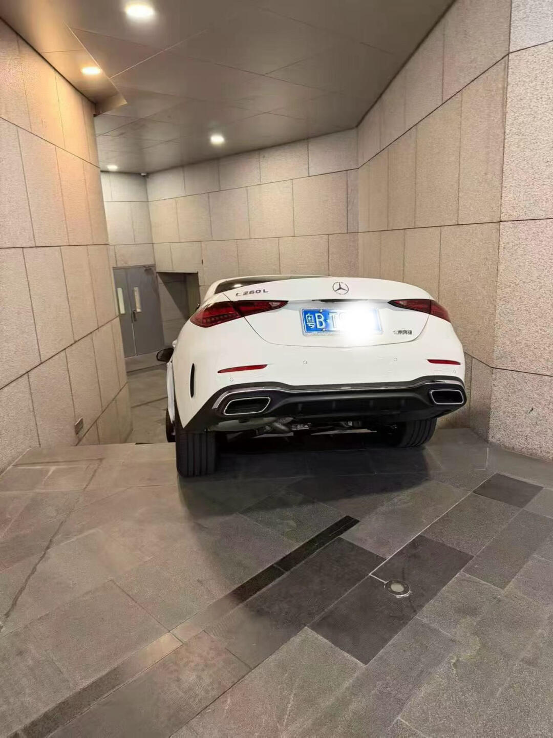 商场门口,一辆奔驰C200卡在入口台阶上,墙上的箭头确实很迷惑人。