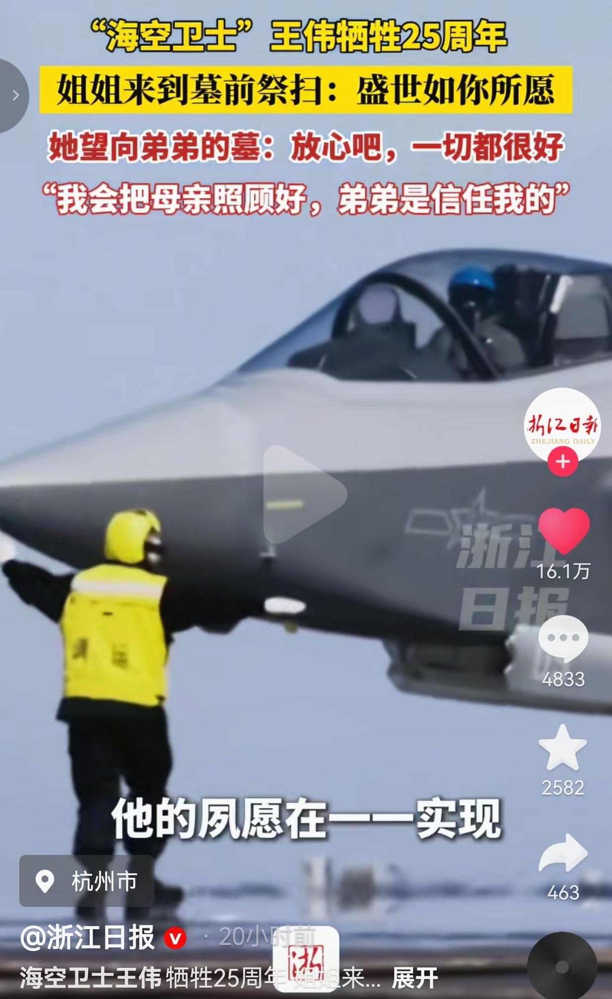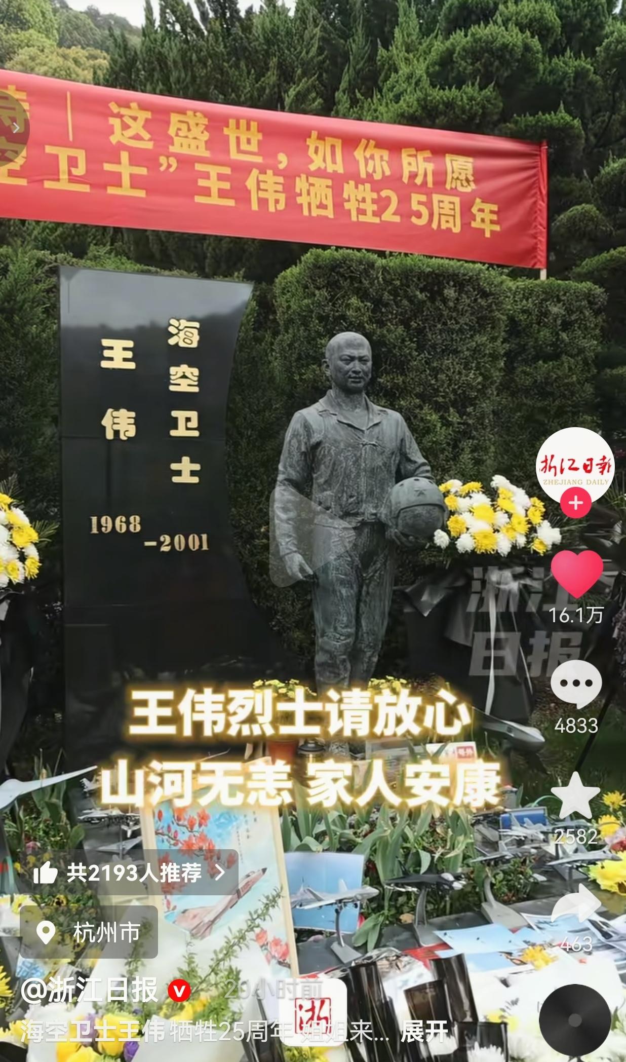王伟牺牲25周年,姐姐墓前一句话看哭无数网友:盛世如你所愿,弟弟你看到了吗? 4月1日,浙江杭州的烈士陵园里,风都带着哽咽。 王伟烈士的姐姐王琳,捧着鲜花,一步一步走到弟弟的墓前。 镜头里的她,头发已经有了白丝,眼角的皱纹里全是岁月的痕迹,可说起弟弟,声音里的思念,25年了,一点都没淡。 她哽咽地说:“我基本上每年都会来这里。我们从小两个人是一起长大的,一晃都几十年过去了。 我会把母亲照顾好,弟弟是信任我的。放心吧,一切都很好,这盛世,正如他所愿。” 就这几句话,让无数国人为之动容和破防。   2001年4月1日,那是刻在每个中国人骨子里的日子。 美军EP-3侦察机非法闯入我国南海领空,王伟驾驶歼-8II战斗机奉命拦截。 在多次警告无效后,美军飞机突然转向,狠狠撞向王伟的战机。 “81192收到,我已无法返航,你们继续前进!” 这是他留给祖国的最后一句话。 那一年,他才33岁,家里有年迈的父母,有深爱他的妻子,还有年幼的儿子。 25年过去了,当年那个年轻的飞行员,永远定格在了33岁。 可他的家人,用一辈子在替他守着这份家国。 姐姐王琳,25年如一日,每年清明都来墓前看弟弟。 她会跟弟弟说家里的事,说母亲身体很好,说祖国越来越强,说当年你用命守护的山河,现在固若金汤。 镜头里,她望着弟弟的墓碑,眼神里全是温柔和坚定:“我也想告慰他,他的夙愿在一一实现,我们的后代,在前赴后继地努力着。” 是啊,英雄你看! 当年你守护的南海,现在有辽宁舰、山东舰、福建舰三艘航母劈波斩浪;当年你驾驶的歼-8,现在有歼-20、歼-35隐身战机翱翔长空;当年你用生命换来的和平,现在我们有足够的实力,再也不会让任何国家肆意挑衅!   网友看到后评论说:每次看到81192都忍不住哭!当年王伟牺牲的时候我还在上小学,现在我儿子都上小学了,25年了,我们从来没忘! 也有的网友说:姐姐说“我会把母亲照顾好”这句话直接给我干破防了!弟弟用命换家国,姐姐用一生守家人,这就是中国人的脊梁! 还有的网友说:当年我们只有歼8,现在我们有三艘航母、五代机!王伟烈士,你看到了吗?这盛世,如你所愿! 也有的网友说:每次给孩子讲王伟的故事都哭,我们今天的安稳日子,是多少像王伟这样的英雄用命换来的!永远铭记!   说实话,每次刷到王伟烈士的新闻,我都忍不住红眼眶。 我们总说“岁月静好”,可哪有什么岁月静好,不过是有人替我们负重前行。 25年前,王伟用生命告诉全世界:中国的领空,中国的领海,不容侵犯! 25年后,我们用强大的国防告诉王伟:你用命守护的祖国,现在没人敢惹! 有人说,时间会冲淡一切。可对于王伟,对于81192,对于所有为祖国牺牲的英雄,中国人的记忆,永远不会褪色。 姐姐王琳25年的坚守,就是最好的证明。 她守的不是一座墓碑,是弟弟的精神,是中国人的骨气,是我们永远不能忘的家国情怀! 我们这代人,享受着英雄用命换来的和平,更要记住这份和平来之不易。 永远不要忘记,当年王伟撞向敌机的那一刻,他心里想的不是自己,是祖国,是人民,是我们今天的安稳日子。   25年,山河无恙,国泰民安。王伟烈士,你看到了吗? 你用生命守护的祖国,已经成为了世界强国;你用热血捍卫的领空,现在有无数战机为我们守护;你牵挂的家人,被我们所有人好好爱着;你期盼的盛世,真的如你所愿! 英雄从未远去,精神永照长空!81192,我们永远等你返航!