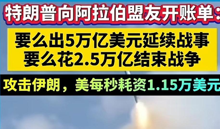 反正无论打还是不打,你们都得出,懂王张口就要5万亿美元…~ 特朗普政府在美伊冲突持续约一个月后,向沙特、阿联酋等海湾国家提出“天价账单”。 具体要价: 若继续军事行动:5万亿美元;若停火撤军:2.5万亿美元称为“战果费”或“停火费”。 按照美国对伊军事行动的成本计算器,美军在中东的高强度行动,军费每小时增长4160万美元,折合每秒耗资1.15万美元,就这还算少呢… 另据,白宫发言人莱维特公开证实,这一方案已进入正式讨论阶段,“美国为地区安全流血,盟友理应买单”今日头条。这一幕,像极了 1991 年海湾战争,美国让中东盟友承担了 80% 军费,如今不过是故技重施。 面对着美国强行勒索保护费,中东国家也是面面相觑,交不交钱,都要挨宰,真是哭天无泪,怎么摊上老美这样的黑老大,做美国的敌人是危险的,做美国的盟友是致命的。