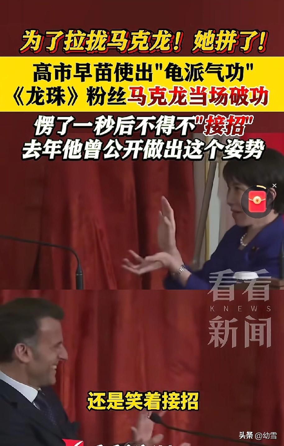 为了拉拢马克龙, 高市早苗拼了! 当众使出“龟派气功”, 马克龙愣了一秒后被迫“接招”。 外交场合秒变漫展现场,日本网友直呼:太尴尬了! 4月1日,马克龙访日会谈现场,日本首相高市早苗为投马克龙所好(马克龙是《龙珠》铁粉),竟在记者会上突然对法国总统摆出“龟派气功”姿势。 马克龙当场愣住,随后尴尬配合。现场画面迅速引爆社交媒体,被批“外交场合cosplay,毫无首相威严”。 据现场视频,高市早苗在记者会尾声突然双手合拢前推,做出《龙珠》经典招式动作。 马克龙先是露出错愕表情,迟疑片刻后才勉强模仿回应。 高市早苗随后还配上“撒娇摆尾”的小动作,试图营造轻松氛围。 这一幕被日本网友痛批“轻浮”、“像在看搞笑艺人表演”。 舆论质疑,在讨论中东局势与安全合作的严肃场合,此举是“用力过猛的表演”,而非正常外交礼仪。 动机剖析:不顾民意的“战争拉拢”, 马克龙此访重点本是稀土合作与中东局势,高市早苗却选择用“动漫梗”拉近关系。 她试图借此掩盖其推动军事扩张、背离和平宪法的实质。 一边在国内加速部署远程导弹、强化“反击能力”,违背民众对和平的向往;另一边却在国际场合装可爱、扮人设,被指“为了个人政治私欲,将国家外交娱乐化”。 “龟派气功”没有打出日法友谊,反而暴露了高市早苗政府的战略焦虑: “这是国家领导人该有的样子吗?” 与其在镜头前“装可爱”,不如正视国内反战民意。 这种低幼化表演,无法掩盖其配合美国战略、妄图发动战争的丑陋本质。 外交不是动漫展,和平也不是靠“龟派气功”打出来的。 高市早苗这波操作,你看吐了吗?欢迎在评论区留下你的看法! 晒图笔记大赛 图片来源于视频截图,若侵权告知必删