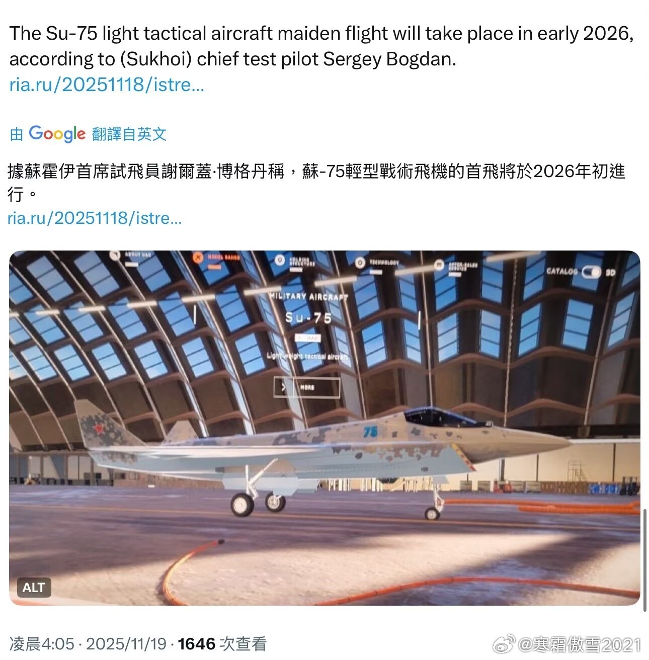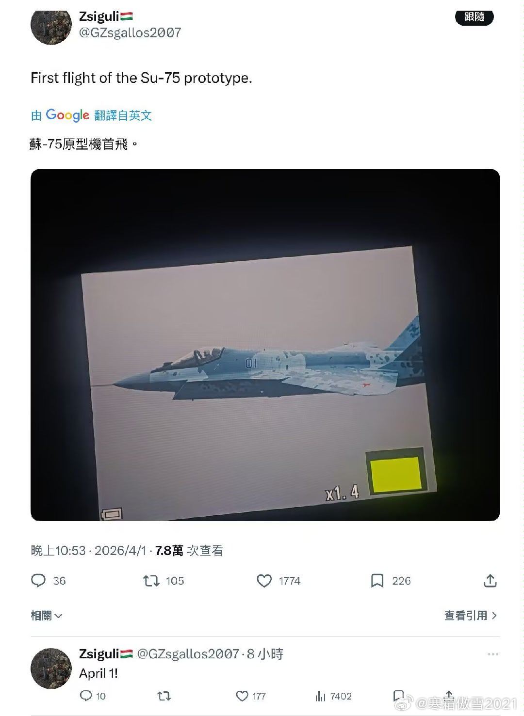 全球武器装备盘点日耳曼赢学愚人节 愚人节乐子图图1是正经新闻功勋试飞员谢尔盖博格丹称苏75将在2026年初首飞。图2是外网乐子人4/1发的苏75首飞图,仍然是第一版气动而且很大概率是个玩笑。根据🦢友关于J20抄袭米格1.44的逻辑、可以断定苏75抄袭J7FS的回旋镖逻辑也成立,看图3和图4相同的下颌进气、相同的进气道隔板和单发。