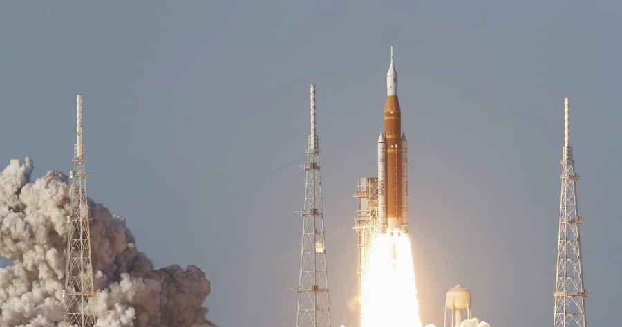 1日,一枚火箭从美国佛罗里达州肯尼迪航天中心发射升空。搭载四名宇航员的猎户座飞船安装在火箭顶部(路透社-共同社)