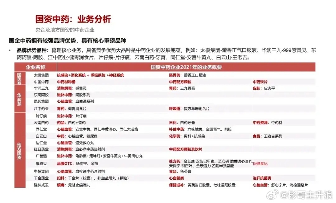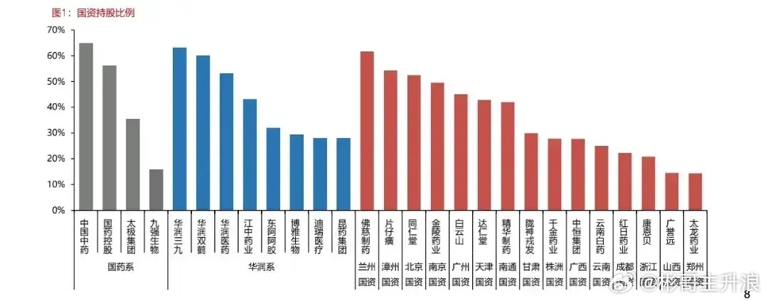 国资中药:国药集团:太极集团(中药)、国药现代(工业)、国药一致(药店)、国药股份(精麻分销)、天坛生物(血制品)、卫光生物(血制品)、九强生物(器械);华润集团:华润三九、昆药集团、江中药业、东阿阿胶、博雅生物、迪瑞医疗、华润微、华润材料;地方国资15家:片仔癀、云南白药、同仁堂、白云山、达仁堂、红日药业、广誉远、康恩贝、中恒集团、精华制药、佛慈制药、千金药业、金陵药业、太龙药业、陇神戎发。
