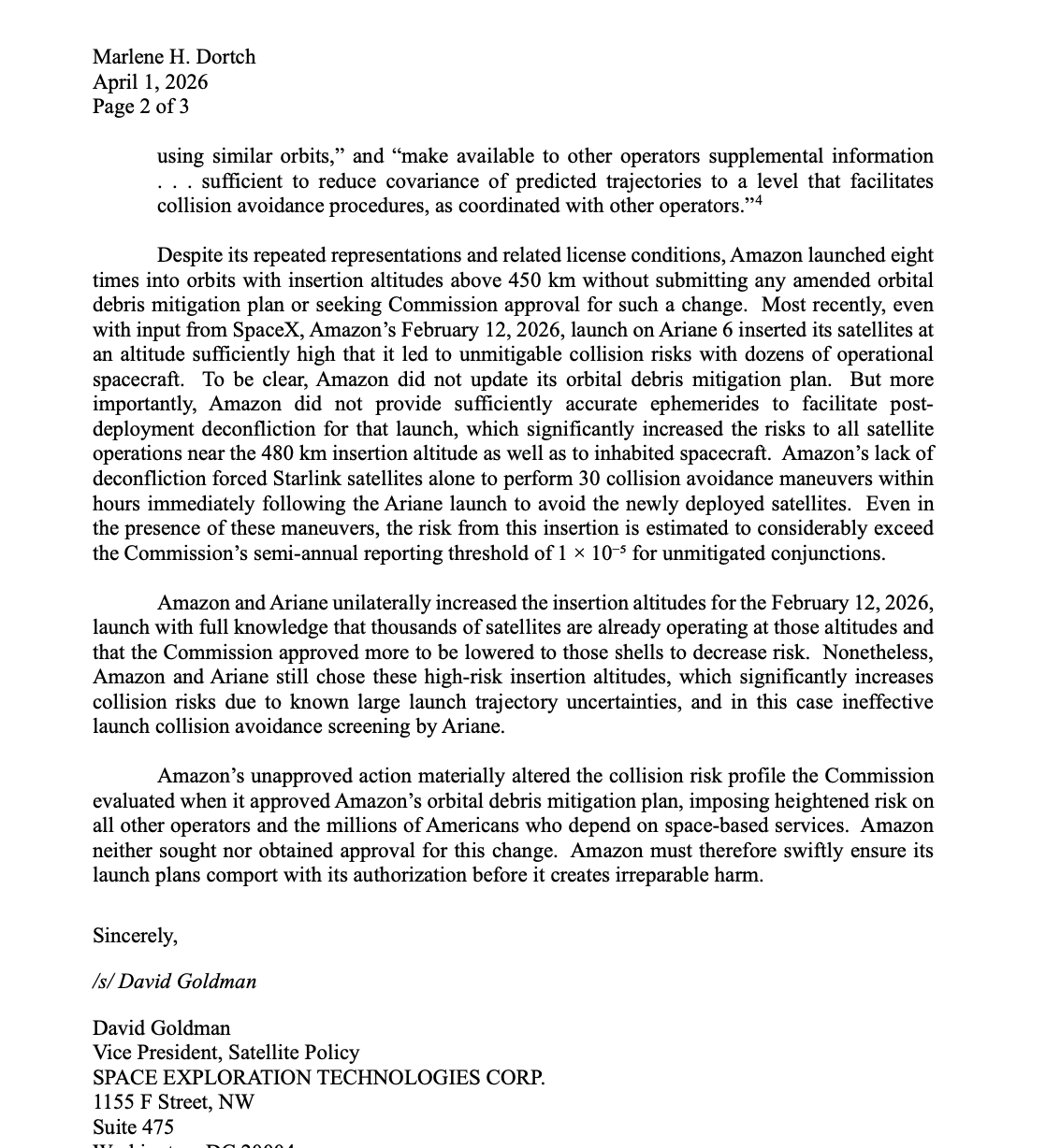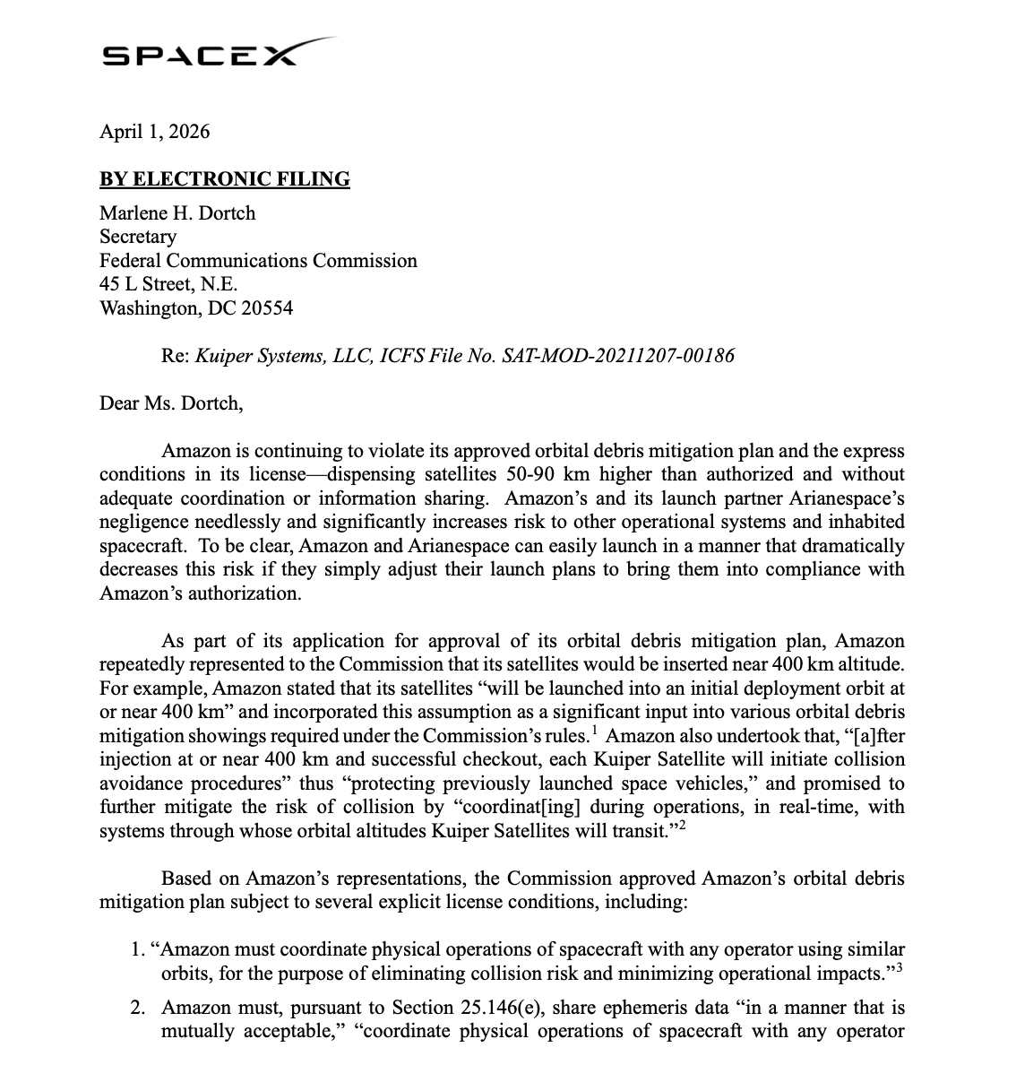 SpaceX已向FCC提交信函,指控Amazon持续违反其获批的空间轨道碎片减缓计划。“Amazon正在比授权高度高出50至90公里的轨道部署卫星,且未进行充分协调与信息共享。Amazon及其发射合作伙伴Arianespace的疏忽,无端且显著增加了对其他在轨运行系统及载人航天器的风险。需要明确的是,只要Amazon与Arianespace调整发射计划使其符合Amazon的许可要求,就可以轻松以大幅降低此类风险的方式实施发射。”