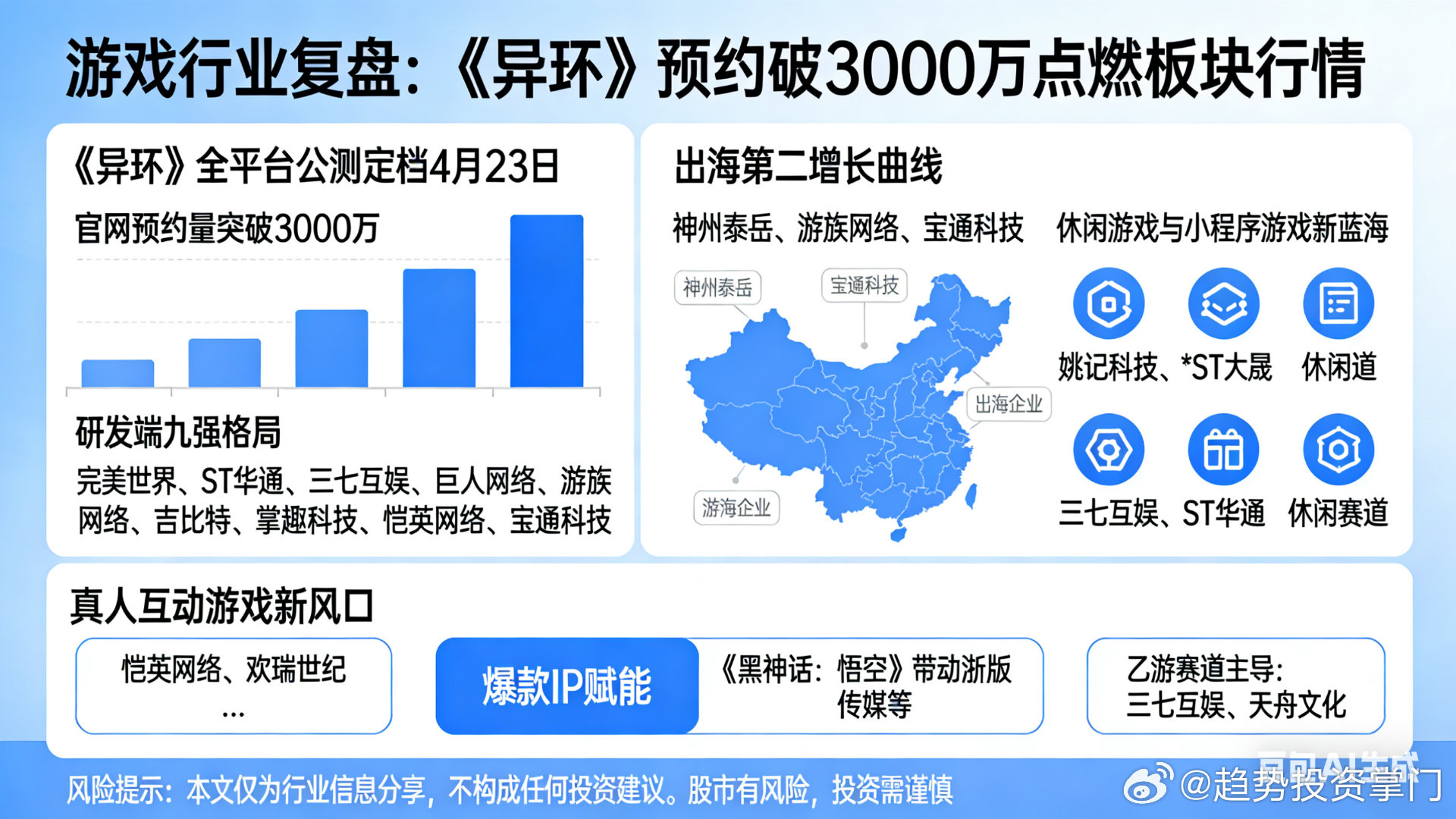 游戏板块复盘:《异环》引爆行情,全赛道机会梳理完美世界《异环》定档4.23,预约破3000万创国产开放世界纪录,叠加版号正常、AI降本、出海爆发,游戏行业进入景气上行周期。核心赛道及标的- 研发龙头:完美世界、ST华通、三七互娱、巨人网络、游族网络、吉比特、掌趣科技、恺英网络、宝通科技- 出海主线:神州泰岳、游族网络、宝通科技、三七互娱、ST华通、盛天网络、汤姆猫、昆仑万维- 休闲&小程序:姚记科技、*ST大晟、盛天网络、掌趣科技、三七互娱、名臣健康、富春股份- 真人互动新风口:恺英网络、欢瑞世纪、电广传媒、百纳千成、ST中青宝、中文在线、富春股份、盛天网络- IP+直播联动:黑神话相关:浙版传媒、华谊兄弟、丝路视觉、迅游科技、利亚德、中信出版乙游&直播:三七互娱、天舟文化、吉比特、恺英网络、浙数文化、汤姆猫、中文传媒、奥飞娱乐行业处于产品大年+技术赋能+全球化扩张三重红利,龙头有望迎来业绩估值双升。⚠️ 以上仅行业信息分享,不构成投资建议,股市有风险,投资需谨慎。