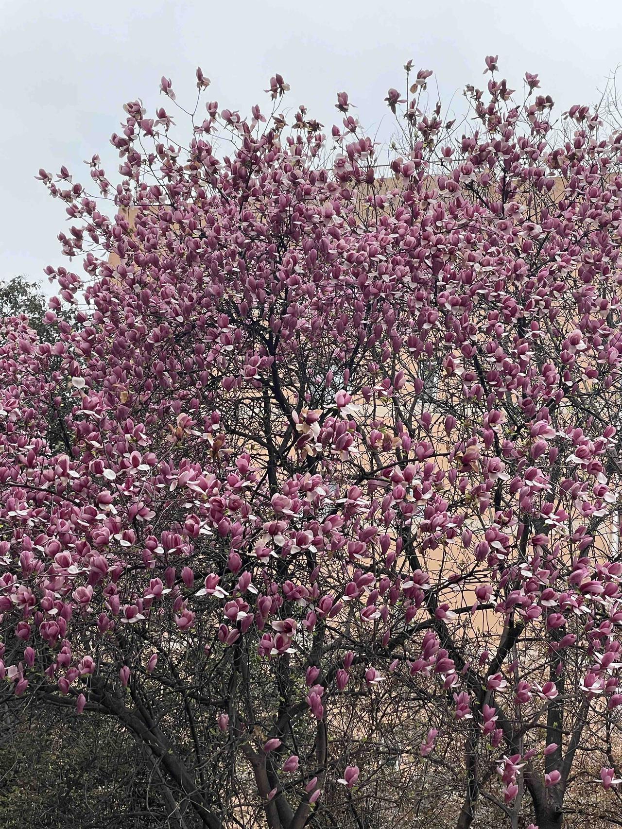 谁懂啊!在城市街头偶遇这一树紫玉兰,直接被狠狠惊艳到!💜 没有绿叶衬托,光秃秃的枝桠上就缀满了花苞与花朵,像蘸满紫墨的毛笔挥毫春日,又似揉碎的云霞落满枝头,艳而不俗,自带清贵气场✨ 深紫的花瓣透着温润质感,向阳的一面泛着粉白渐变,阳光一照更显通透。满树繁花挤挤挨挨,把料峭春寒都驱散,只留满屏的温柔与热烈🌿 站在花树下抬头望,枝头的紫花映着楼宇,随手一拍都是氛围感大片。这才是春天该有的样子呀~ 紫玉兰 春日赏花 城市里的浪漫 花开满枝头