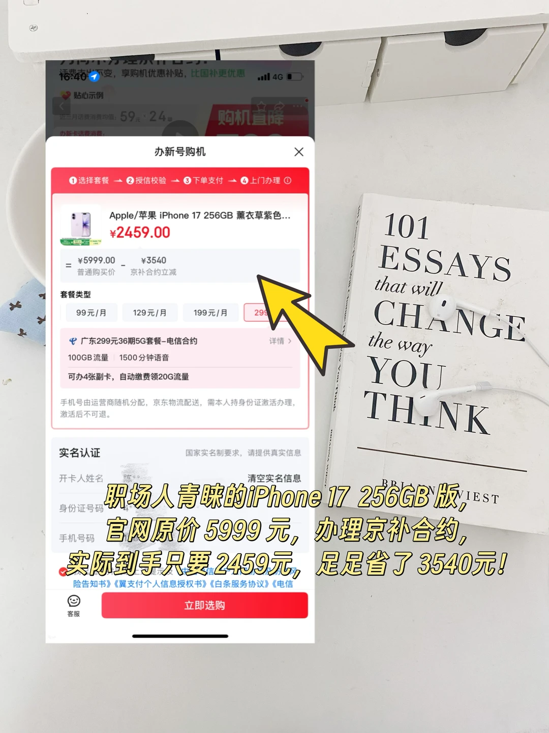 职场人青睐的iPhone 17 256GB 版,官网原价 5999 元,办理京补合约(选电信 299 元 36 期 5G 套餐,含每月 100GB 流量 + 1500 分钟语音)后,算上购机立减和长期通讯补贴,实际到手只要 2459元,足足省了 3540元! [喝奶茶R]