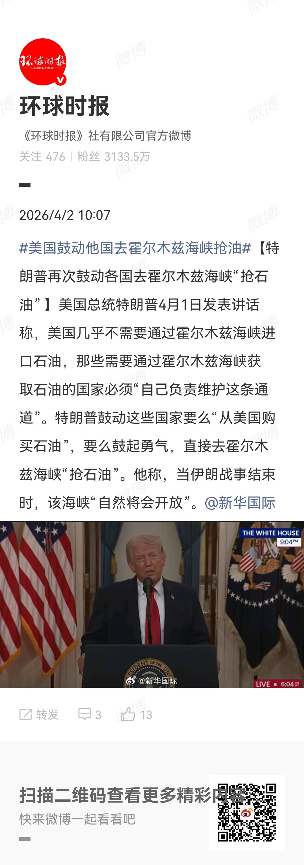 看到这条新闻,让人不由地感叹:人类似乎回到了旧(新)石器时代,貌似谁的拳头大谁就能抢到食物。这是美国关于“鼓励他国去霍尔木兹海峡抢石油”的相关表述: 2026年3月31日,特朗普在社交媒体对因霍尔木兹海峡封锁缺油的国家(如英国)提两点建议:从美国购油;“鼓起勇气去海峡把油运走/抢过来” 。 同日白宫与国防部明确表示:美国将在2–3周内结束对伊军事行动,不再单独保障海峡安全,应由依赖航道的国家自行负责。 4月1日特朗普总统全国讲话时重申:维护霍尔木兹海峡不是美国责任,各国需自主维护能源通道。 一场美以伊冲突,让人类社会倒退上万年。我们反对将以前基于文明的游戏规则强行“GAME OVER”。