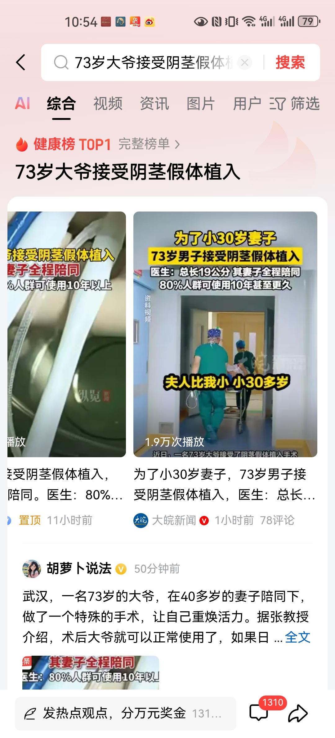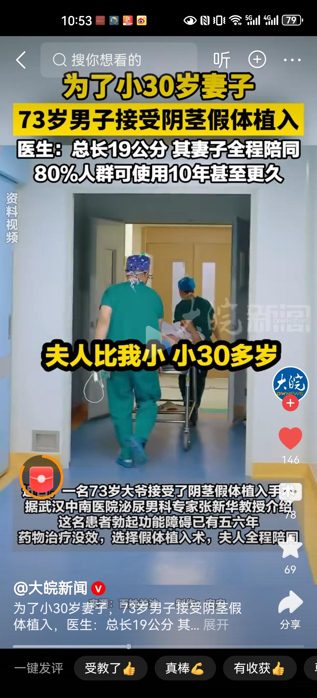 湖北武汉中南医院。针对一位苦恼的73岁大爷,做了阴茎假体植入手术。术后长达19厘米,功能正常使用,最长可以用10来年呢!如果其他功能都配合,还可以生孩子呢。这边大爷在五六年前已经患有勃起功能障碍,药物治疗没有效果,最终在小30多岁的妻子支持下做了这个手术。 虽然人口在老龄化,但是老年人口寿命在不断的延长。让他们老年生活更加有质量,确实要关心他们的需求和痛点。老夫少妻,如果在各方面不和谐,携手走到最后也很难。这也给很多老年人指出了一条明路,现在科技这么发达,实在不行做个手术去,还能有效的促进消费,还能促进消费升级。