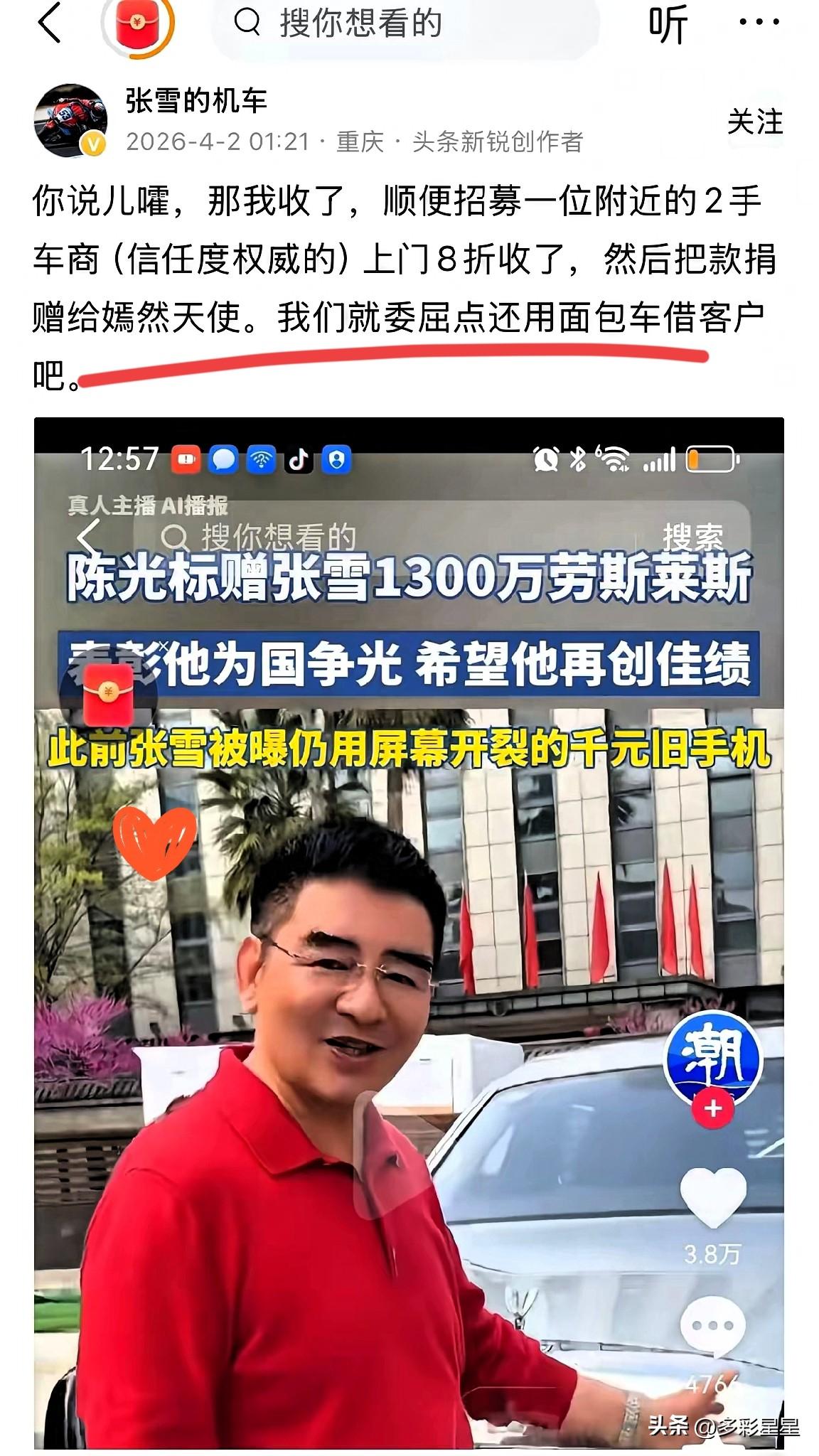 张雪机车回应标哥了。 之前标哥为了祝福张雪机车夺冠,发视频说要把他自己新买的一辆2026最新款的劳斯莱斯送给他。 之前为了祝贺张雪夺冠,标哥豪气放话,要送出最新款2026劳斯莱斯当作贺礼,不少人还以为只是场面话,没想到张雪真的认真接下了这份大礼。更让人意外的是,他没有选择自己留用,而是打算直接转手卖给二手车行,将全部卖车所得捐给嫣然基金,一分不留。 这波操作既接住了对方的心意,又用善意完成了升华,比起收下豪车炫富,这样的做法反而更圈粉,也让原本的祝福有了更实在的意义。这下轮到标哥哭笑不得了,原本只是一句祝福,没想到对方真敢接还这么会做。